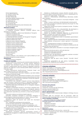 WWW.GHIDULPRIMARIILOR.RO JUDE%u021aUL BIHOR / 107Firme reprezentativeSC VALENTI IMPEX SRLSC NUTRISUIN SRLSC BON TRANS SRLVAN DEN HEERIK AGRICOLA SRLSC LIDLE ROMANIA SCSSC MARCONF SASC STILO EVORA SRLS.C. NUTRITIN SRLREWE PROJECTENTWICKLUNG ROMANIA SRLSC ORION SHOES SRLObiective turistice:1. %u015etrand geotermal cu complex de fizioterapie2. Catedrala Ortodoxa ,,Biserica ortodox%u0103 Sf%u00e2ntul Ioan Botez%u0103torul%u201d Marghita3. Biserica Ortodoxa ,, Sf%u00e2ntul Ioan Botez%u0103torul%u201d Marghita4. Biserica Ortodox%u0103 Che%u01635. Biserica Ordodoxa Ghenetea6. Catedrala Romano-Catolica ,,Sf. Margareta%u201d Marghita7. Biserica Reformat%u0103 Marghita8. Biserica Reformata Che%u01639. Biserica Greco-Catolica Marghita10. Biserica Greco-Catolica Ghenetea11. Biserica Greco-Catolica Che%u016312. Biserica Penticostal%u0103 Salem13. Biserica Penticostal%u0103 maghiara14. Biserica baptista %u201c Sfinta Treime%u201d15. Biserica baptista maghiar%u010316. Biserica baptista Che%u016317. Oaza spiritualit%u0103%u021bii18. Oaza timpuluiOportunit%u0103%u021bi:Turismul balnear %u0219i de relaxare, sunt oportunit%u0103%u021bile pe care Municipiul Marghita le poate exploataEvenimente:Zilele Municipiului MarghitaProiecte de investi%u0163ii:%u00ceN ANUL 2025 VOR FI CONTINUATE URM%u0102TOARELE PROIECTE:Reabilitarea, modernizarea %u0219i dotarea spa%u021biilor Bibliotecii Municipale %u201cIoan Munteanu%u201d pentru a crea un centru culturalrecreativ, modernizarea parcului central %u0219i realizarea culoarului pietonal de leg%u0103tur%u0103 %u00een zona central%u0103 (SMIS 123125, finan%u021bat prin POR 2014-2020)Centru Educa%u021bional Multifunc%u021bional %u201cOctavian Goga%u201d, cod SMIS: 125905 (finan%u021bat prin POR 2014-2020)Centru Multifunc%u021bional Recreativ Marghita, cod SMIS 125904 (finan%u021bat prin POR 2014-2020)Proiect integrat pentru dezvoltarea durabil%u0103 %u00een zona montan%u0103 a jude%u021bului Bihor, %u00eembun%u0103t%u0103%u021birea accesului %u0219i dezvoltarea serviciilor de s%u0103n%u0103tate %u00een cazul interven%u021biilor medicale %u00een situa%u021bii de urgen%u021b%u0103 - faza Full Application%u201d ROHU 449Promovarea unei abord%u0103ri integrate privind %u00eembun%u0103t%u0103%u021birea ratei de ocupare a for%u021bei de munc%u0103 %u0219i a dezvolt%u0103rii afacerilor la nivelul microregiunilor Marghita %u0219i Beretty%u00f3%u00fajfalu, ROHU 359Reabilitare pod peste r%u00e2ul Barc%u0103u, str. I.L. Caragiale, Marghita (finan%u021bat prin PNDL II)Realizare promenad%u0103 termal%u0103 %u00een Municipiul Marghita-PUZprin %u00eencadrarea %u0219trandului municipal cu extinderea stadiului urbanistic pe terenurile aflate %u00een proprietatea UAT Marghita spre zona destinat%u0103 Casei Bihorului, limitrof cu malul st%u00e2ng al p%u00e2r%u00e2ului Eger.LOCUIN%u021aE, SERVICII %u0218I DEZVOLTARE PUBLIC%u0102Extindere canalizare menajer%u0103 %u00een Municipiul Marghita %u0219i retehnologizare sta%u021bie de pompare, str. Horea - Execu%u021bie PNDLExtindere re%u021bea %u0219i bran%u0219amente la canalizareReabilitare sta%u021bie de epurare ape uzate din Municipiul Marghita, str. G%u0103riiCNI - COMPANIA NA%u021aIONAL%u0102 DE INVESTI%u021aII:Construire baza sportiv%u0103 tip 1, strada Petofi SandorConstruire %u0219i dotare Complex sportiv, str. Salc%u00e2milor, nr.10SF- Construire complex de agrement AQUAPARK, dotarea %u0219i amenajarea incintei, str. ProgresuluiModernizarea ambulatoriului Spitalului Municipal %u201cdr. Pop Mircea%u201d - dotare cu lift, str. Eroilor, nr.14Reabilitarea, extinderea, dotarea, amenajarea incintei %u0219i eficientizarea energetic%u0103 a cl%u0103dirii prim%u0103riei municipiului, Calea Republicii, nr.1Dotarea %u0219i modernizarea Liceului Teoretic Horvath Janos - construire cl%u0103dire multifunc%u021bional%u0103 D+P+M, str. 1 Decembrie, nr.3Construire Cre%u0219%u0103 medie %u2013 70 de copiiPOR N-V - PROGRAMUL OPERATIONAL REGIONAL NORDVEST TEHNICA:M%u0103suri de regenerare urban%u0103 %u00een municipiul Marghita - zona centralPNRR - PLANUL NA%u021aIONAL DE REDRESARE %u0218I REZILIEN%u021a%u0102:Renovare energetic%u0103 moderat%u0103 a Spitalului Municipal %u201cDr. Pop Mircea%u201d, corp chirurgieAsigurarea infrastructurii pentru transportul verde - ITS %u0219i/sau alte infrastructuri TICElaborarea %u00een format GIS a documentelor de amenajare a teritoriului %u0219i de planificare urban%u0103 - PUG respectiv PUZConstruirea de locuin%u021be pentru tineriDotare cu mobilier, materiale didactice %u0219i echipamente digitale a unit%u0103%u021bilor de %u00eenv%u0103%u021b%u0103m%u00e2nt ANGHEL SALIGNY -PROGRAMUL NA%u021aIONAL DE INVESTI%u021aII:Reabilitare %u0219i modernizare str%u0103zi %u00een localit%u0103%u021bile apar%u021bin%u0103toare Municipiului Marghita AFIR - AGEN%u021aIA PENTRU FINAN%u021aAREA INVESTI%u021aIILOR RURAL:%u00cembun%u0103t%u0103%u021birea infrastructurii rutiere agricole %u00een Municipiul MarghitaAFM - ADMINISTRA%u021aIA FONDULUI PENTRU MEDIU:Asigurarea infrastructurii pentru transportul verde puncte de re%u00eenc%u0103rcare vehicule electriceRealizare piste pentru biciclete %u00een municipiul Marghita (spre Che%u021b)Sta%u021bii de re%u00eenc%u0103rcare pentru vehicule electricePiste de biciclete (spre Ghenetea)CONSILIUL JUDE%u021aEAN BIHOR:%u00cenfiin%u021bare parc de specializare inteligent%u0103, realizare racorduri utilit%u0103%u021bi %u0219i c%u0103i de acces (parcul industrial)BUGETUL LOCAL:Construire sal%u0103 de sport Liceul Teoretic %u201cHorv%u00e1th J%u00e1nos%u201d Marghita Reabilitare gospod%u0103rire de ap%u0103 pentru localit%u0103%u021bile Che%u021b, Ghenetea %u0219i str. Salc%u00e2milor din MarghitaCOMUNA M%u0102D%u0102RA%u015eAdres%u0103: Principal%u0103, nr. 1; Cod po%u0219tal: 417330Telefon: 0259-379432; Fax: 0259-379493; Adresa de e-mail: primaria_madaras@yahoo.comURL: https://madaras-bh.ro/COMUNA M%u0102GE%u015eTIAdres%u0103: Principala, nr. 9Cod po%u0219tal: 417335Telefon: 0359-806908; Fax: 0359-806