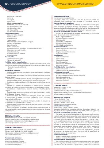 164 / JUDE%u021aUL BRA%u0218OV WWW.GHIDULPRIMARIILOR.ROExploat%u0103ri forestiereComer%u0163TransportAgricultur%u0103Firme reprezentative:ROMCIM - Fabrica de CimentSC Vectra Service SRLSC Aletta Com SRLSC Vioserb%u00a0SRL SC Profi Rom%u00a0Food SRLObiective turistice:P%u0103durea Valea Bog%u0103%u021biiValea TrestieiCheile DopcaValea Lup%u0219eiMicrocanionul %u00een bazalt de la HoghizCariera tuf vulcanicParcul HoghizCotul TurzunuluiBiserica ortodox%u0103%u00a0din lemn ,, Cuvioasa Paraschiva%u201dBiserica reformat%u0103%u00a0HoghizCastelul KalnokyCastelul Gutman Valenta Castelul HallerEvenimente:Zilele Comunei Hoghiz T%u00e2rguri de animaleFacilit%u00e3%u0163i oferite investitorilor:Oportunit%u0103%u021bi oferite investitorilor (terenuri, facilit%u0103%u021bi fiscale, for%u021b%u0103 de munc%u0103 calificat%u0103 existent%u0103, resurse naturale ce pot fi exploatate):- for%u021b%u0103 de munc%u0103 calificat%u0103- terenProiecte de investi%u0163ii:Modernizare drumuri comunale %u2013 drum de leg%u0103tur%u0103 Cuciulata %u2013 Lup%u0219a DC20Modernizare drum local Cuciulata %u2013 B%u0103ie%u0219i, Comuna Hoghiz, Jude%u021bul Bra%u0219ovConstruire gr%u0103dini%u021b%u0103 %u0219i centru de zi %u00een sat Bogata, Comuna HoghizImpementare proiect de %u201eInovare %u00een economia social%u0103%u201dRealizarea cadastrului genral %u00een Comuna Hoghiz, finan%u021bat de ANCPIDotare cu tablete %u0219i echipamente IT pentru %u0219coala on-line a unit%u0103%u021bilor de %u00eenv%u0103%u021b%u0103m%u00e2nt din comuna Hoghiz din jude%u021bul Bra%u0219ovReabilitare, modernizare, dotare Centru Multifunc%u021bional HoghizModernizare drum communal DC25, KM 0+000-KM7 + 650, DN13 Bogata %u2013 Dopca -Mateia%u0219Realizare re%u021bea de canalizare menajer%u0103, sta%u021bie de epurare %u0219i bran%u0219ament %u00een satele Cuciulata, F%u00e2nt%u00e2na %u0219i Lup%u0219a, comuna Hoghiz, jude%u021bul Bra%u0219ovRealizare re%u021bea de canalizare menajer%u0103, sta%u021bie de epurare %u0219i bran%u0219ament %u00een satele Bogata %u2013 DopcaReabilitare %u0219i modernizare re%u021bea de iluminat public %u00een Comuna Hoghiz, Jude%u021bul Bra%u0219ov%u00cenfiin%u021bare sistem intelligent de distribu%u021bie gaze naturale %u00een comuna Hoghiz, satele apartin%u0103toare Bogata Olteana %u2013Dopca, jude%u021bul Bra%u0219ovCOMUNA HOLBAVAdres%u0103: Principal%u0103, nr. 39; Cod po%u0219tal: 507272Telefon: 0268-483670, 483669; Fax: 0268-483669; Adresa de e-mail: primaria_holbav@yahoo.comURL: http://primariaholbav.ro/COMUNA HOMORODAdres%u0103: Principal%u0103, nr. 403; Cod po%u0219tal: 507105Telefon: 0268- 286542; Fax: 0268-286601; Adresa de e-mail: primariahomorod@yahoo.comURL: www.homorod.roPersoane din primarie:Primar: %u0218tefan Doru %u0218onaViceprimar:Bogdan Codrea%u00a0Secretar General: Alina Puscas%u00a0Contabil:Zoica C%u0103p%u0103%u0163%u00eena%u00a0Sate %u00een administra%u021bie:Homorod, Merchea%u015fa, JimborSuprafa%u021ba:%u00a0 11958 ha; Intravilan:%u00a0 365 ha; Extravilan:%u00a0 11593 ha; Popula%u021bia:%u00a02209; Gospod%u0103rii:%u00a01210; Locuin%u021be:%u00a01157; Gr%u0103dini%u021be:%u00a03; %u0218coli:%u00a04; Cum se ajunge in localitate:Comuna este situat%u0103 la o distan%u021b%u0103 de 4 km de ora%u0219ul Rupea, unde se poate ajunge pe drumul E60 (Bra%u0219ov %u2013 T%u00e2rgu Mure%u0219). Distan%u021ba fa%u021b%u0103 de Bra%u0219ov este de 62 km, iar fa%u021b%u0103 de Sighi%u0219oara de 58 km, ceea ce face ca accesul rutier s%u0103 fie facil %u00een aceast%u0103 zon%u0103.Activitati economice si specifice zonei:Zootehnie, aglomerare de fermieri performan%u021bi cu un num%u0103r mare de animale, mici %u00eentreprinz%u0103toriFirme reprezentative:SC PROD IMPEX OLIMPIASC LIVAMERSC FERMA HOMORODSC HOMOROD FARM PFA PELEI ALEXANDRUObiective turistice:Biserica Fortificat%u0103%u00a0HomorodCetatea JimborStejarul secular MercheasaVulcanii noroio%u0219iEvenimente:Festivalul RecolteiGorun TrailFii satului JimborBalul StrugurilorSaptamana HaferlandBalul de Cr%u0103ciunFacilit%u00e3%u0163i oferite investitorilor:Spa%u021bii comercialeTeren construc%u021bie hale industrialeProiecte de investi%u0163ii:Renovare Cetatea JimborEficientizarea energiei %u00een %u0219coli %u0219i gr%u0103dini%u021b%u0103Extindere ap%u0103-canal%u00cenfiin%u021b%u0103ri spa%u021bii de joac%u0103Parc%u0103ri %u0219i trotuareCOMUNA JIBERTAdres%u0103: Principal%u0103, nr. 129Cod po%u0219tal: 507110Telefon: 0268-285528; Fax: 0268-285643; Adresa de e-mail: primaria_comunajibert@yahoo.comURL: www.primariajibert.roPersoane din primarie:Primar:%u00a0%u0218tef%u0103ni%u021b%u0103 P%u00eetea%u00a0%u00a0Viceprimar: Vasile ButaSecretar General: Leti%u021bia PipeiContabil:%u00a0Maria Georgeta%u00a0%u0218erban%u00a0Sate %u00een administra%u021bie:Jibert, Dacia, Lovnic, Grinari, V%u0103leniSuprafa%u021ba:%u00a0 16612,72 ha; Intravilan:%u00a0 232 ha; Extravilan:%u00a0 16380,72 ha; Popula%u021bia:%u00a02535; Gospod%u0103rii:%u00a0901; Locuin%u021be:%u00a01089; Gr%u0103dini%u021be:%u00a05; %u0218coli:%u00a05; Activitati economice si specifice zonei:For%u021ba de munc%u0103 este specializat%u0103 %u00een diverse domenii precum croitorie, agricultur%u0103, construc%u021bii %u0219i zootehnie, exist%u00e2nd %u00een comun%u0103 mai mul%u021bi agen%u021bi economici (se poate %u00eenfiin%u021ba %u0219i un atelier de croitorie). Unul dintre cei mai importan%u021bi este SC. Lorebeca SRL, ce se ocup%u0103 de prelucrarea lemnului %u0219i are 8 angaja%u021bi permanent. Popula%u021bia este disponibil%u0103 s%u0103 ajute dezvoltarea a%u0219ez%u0103rii oferind tot ceea ce este necesar. Astfel se poate investi %u00eentr-o agricultur%u0103 organizat%u0103, cultivandu-se p%u0103ioase, sfecl%u0103 de zah%u0103r, pra%u0219itoare, dar se poate dezvolta %u0219i legumicultura, pomicultura - datorit%u0103 terasamentului cu expunere - put%u00e2ndu-se astfel forma puncte de colectare %u0219i prelucrare fructe - legume, linii de panifica%u021bie %u0219i mor%u0103rit %u02
