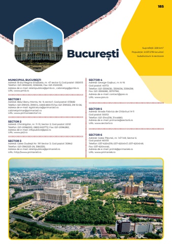Suprafa%u021b%u0103: 228 km%u00b2Popula%u021bie: 2.037.278 locuitori Bucure%u0219ti Subdiviziuni: 6 sectoareMUNICIPIUL BUCURE%u015eTIAdres%u0103: B-dul Regina Elisabeta, nr. 47 sector 5; Cod po%u0219tal: 050013Telefon: 021-3055500, 3055555; Fax: 021-3120033; Adresa de e-mail: relatiipublice@pmb.ro , cabinetpg@pmb.ro URL: www.pmb.roSECTOR 1Adres%u0103: Bdul Banu Manta, Nr. 9, sector1; Cod po%u0219tal: 013682Telefon: 021-3191013, 3191014, 0.800.800.111;Fax: 021-3191033, 319 10 06; Adresa de e-mail: egistratura@primarias1.rocabinetprimar@primarias1.ro URL: www.primariasector1.roSECTOR 2Adres%u0103: Chiristigiilor, nr. 11-13, Sector 2; Cod po%u0219tal: 22121Telefon: 021-2096000, 0800.500772; Fax: 021-2096282; Adresa de e-mail: infopublice@ps2.roURL: www.ps2.roSECTOR 3Adres%u0103: Calea Dude%u015fti Nr. 191 Sector 3; Cod po%u0219tal: 30842Telefon: 021-3180323-29, 3180335; Adresa de e-mail: relatiipublice@primarie3.roURL: http://www.primarie3.roSECTOR 4Adres%u0103: George Co%u015fbuc, nr. 6-16Cod po%u0219tal: 40172Telefon: 021-3359230, 3359236, 3359238; Fax: 021-3359280, 3370790; Adresa de e-mail: contact@ps4.roURL: www.ps4.roSECTOR 5Adres%u0103: Strada Fabrica de Chibrituri 9-11Cod po%u0219tal: 50012Telefon: 021-3144318, 3144680; Adresa de e-mail: primarie@sector5.roURL: www.sector5.roSECTOR 6Adres%u0103: Calea Plevnei, nr. 147-149, Sector 6Cod po%u0219tal: 60013Telefon: 037-6204319, 037-6204147, 037-6204149; Fax: 037-6204446; Adresa de e-mail: prim6@primarie6.roURL: www.primarie6.ro185