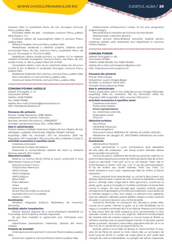 WWW.GHIDULPRIMARIILOR.RO JUDE%u021aUL ALBA / 29timpului liber %u00een localitatea Pianu de Jos, Strungari Comuna Pianu, jude%u021bul AlbaExtindere re%u021bele de ap%u0103 %u2013 canalizare, comuna Pianu, jude%u021bul Alba Etapa a- II-aFinalizare sistem de supraveghere video %u00een comuna Pianu, jude%u021bul AlbaRefacere Pode%u021be, comuna Pianu, jude%u021bul AlbaReabilitarea moderat%u0103 a cl%u0103dirilor publice, Cl%u0103direa %u0218colii Gimnaziale Pianu de Sus, Comuna Pianu, localitatea%u00a0 Pianu de Sus, str. Principal%u0103 nr. 172 C10-I3-2820Reabilitare cl%u0103dire %u0219coal%u0103 primar%u0103, cu clasele I-IV %u00een vederea cre%u0219terii eficien%u021bei energetice, Comuna Pianu, Sat Pianu de Jos, strada Horea, nr. 165 A, jude%u021bul Alba C10-I3-1326Consolidare sistem rutier drum calamitat Valea Leii, de la km 0+0.00 la km 0+260.00 %u00een localitatea Strungari, Comuna Pianu, jude%u021bul AlbaReabilitare Gr%u0103dini%u021b%u0103, Pianu de Sus, comuna Pianu, jude%u021bul AlbaParc Fotovoltaic %u00een comuna Pianu, jude%u021bul AlbaConstruire Sediu Prim%u0103rie, comuna Pianu, jude%u021bul AlbaCOMUNA POIANA VADULUIAdres%u0103: Principal%u0103, nr. 27Cod po%u0219tal: 517545Telefon: 0258-701859; Fax: 0258-701856; Adresa de e-mail: primaria@poianavadului.roURL: http://poianavadului.roPersoane din primarie:Primar: Toader Beniamin: 0786-395314Viceprimar: Claus-Cosmin TolomeiuSecretar General: Maria Briciu : 0786395317Contabil:%u00a0L%u0103cr%u0103mioara Maria %u021a%u00e2rc%u00a0: 0786-395311Sate %u00een administra%u021bie:Poiana Vadului, Coste%u015fti, Duduieni, F%u0103getu de Sus, F%u0103getu de Jos, H%u0103n%u0103%u015fe%u015fti, Lup%u0103ie%u015fti, Morc%u0103ne%u015fti, P%u0103%u015fte%u015fti, Petelei, St%u0103ne%u015ftiSuprafa%u021ba:%u00a0 2905 ha; Intravilan:%u00a0 270 ha; Extravilan:%u00a0 2635 ha; Popula%u021bia:%u00a01197; Gospod%u0103rii:%u00a0391; Locuin%u021be:%u00a0484; Gr%u0103dini%u021be:%u00a03; %u0218coli:%u00a05; Activitati economice si specifice zonei:Cre%u015fterea animalelorRecoltarea fructelor de p%u0103durePrelucrare %u015fi comercializare obiecte din lemn %u015fi material lemnos, specific %u0163%u0103rii mo%u0163ilorObiective turistice:Biserica cu hramul Sfin%u021bii%u00a0 Mihail %u015fi Gavril, construit%u0103 %u00een anul 1869 Mester Florianus PukelStatuia lui Avram IancuTroi%u0163a Eroilor NeamuluiV%u00e2rful CiorasaV%u00e2rful Dr%u0103ghi%u0163aV%u00e2rful M%u0103gura%u015eesul Ple%u015fiiPiatra B%u0103tr%u00e2niiCiteraMoara de ap%u0103Se pot face drume%u0163ii (cu piciorul)Muntele G%u0103ina (vf. Curcub%u0103ta)Dealul cu melciEvenimente:S%u0103rb%u0103tori religioase (Cr%u0103ciun, Boboteaza, 40 mucenici, S%u00e2nziene)Facilit%u00e3%u0163i oferite investitorilor:Poiana Vadului dispune de o zon%u0103 pitoreasc%u0103 deosebit%u0103 ca frumuse%u0163e, zon%u0103 lini%u015ftit%u0103 %u015fi retras%u0103, nepoluat%u0103Se pot face investi%u0163ii %u00een agroturism prin %u00eenfiin%u0163area unor pensiuniValorificarea poten%u0163ialului meseriilor, obiecte din lemn, ciubereProiecte de investi%u0163ii:Amenajare acces %u0219i parcare %u00een comuna Poiana Vadului jude%u021bul AlbaConstruire capela %u00een comuna Poiana Vadului jude%u021bul AlbaModernizarea infrastructurii rutiere 10 km prin programul Anghel SalignyRecondi%u021bionare instalatie de iluminat sat Morc%u0103ne%u0219tiRealizare plan urbanistic generalProiect privind %u00eembun%u0103t%u0103%u021birea serviciilor publice pentru cre%u0219terea calit%u0103%u021bii vie%u021bii cet%u0103%u021benilor prin digitalizare %u00een comuna Poiana VaduluiCOMUNA PONORAdres%u0103: Principal%u0103, nr. 84Cod po%u0219tal: 517565Telefon: 0258-784130; Fax: 0258-784130; Adresa de e-mail: primariaponor@yahoo.comURL: https://www.comunaponor.roPersoane din primarie:Primar: Petru%u0163 BujorViceprimar: Lucian Drago%u0219 BlagaSecretar cu atributii: Maria StanContabil: Maria Speran%u0163a FeleaSate %u00een administra%u021bie:Ponor, Dup%u0103-Deal, Vale %u00een Jos, Valea Bucurului, Geogel, M%u0103c%u0103re%u015ftiSuprafa%u021ba:%u00a0 5196 ha; Intravilan:%u00a0 190 ha; Extravilan:%u00a0 5006 ha; Popula%u021bia:%u00a0568; Gospod%u0103rii:%u00a0340; Locuin%u021be:%u00a0376; %u0218coli:%u00a01; Activitati economice si specifice zonei:Cre%u0219terea animalelorPrelucrarea lapteluiFirme reprezentative:S.C. MONTANA CAD SRLProduc%u0103tori locali:PFA %u0219i IF Obiective turistice:T%u0103ul MlhuaV%u00e2n%u00e2t%u0103rile PonoruluiCheile GeogeluluiMonument istoric BISERICA SF. MIHAIL %u0218I GAVRIL GEOGELM%u0103n%u0103stirea de c%u0103lug%u0103ri SF, NECTARIE%u0219i M%u0103n%u0103stirea de maici SF. SPIRIDONEvenimente:OBICEIURI %u015eI TRADI%u0162IILimba ponorenilor e curat rom%u00e2neasc%u0103, spre deosebire de alte p%u0103r%u0163i ale Ardealului , dar totu%u015fi putem deosebi c%u00e2teva particularit%u0103%u0163i mai arhaice.%u00centre ei locuitorii, indiferent de v%u00e2rst%u0103 sau grad de rudenie, nu prea %u00eentrebuin%u0163eaz%u0103 pronumele de referin%u0163%u0103 dec%u00e2t fa%u0163%u0103 de str%u0103ini. Copiii zic p%u0103rin%u0163ilor %u201cm%u0103i tat%u0103%u201d ori la un om b%u0103tr%u00e2n %u201ctete%u201d, dar %u00een fraz%u0103 folosesc %u015fi ast%u0103zi %u201cm%u0103%u201d sau %u201cvoi%u201d %u00een loc de dumneavoastr%u0103. %u00cen loc de %u201caceea%u201d sau %u201cacela%u201d folosesc %u201ch%u0103la%u201d sau %u201chaia%u201d. Cu toate acestea ei sunt cul%u0163i, respectuo%u015fi fa%u0163%u0103 de str%u0103ini %u015fi foarte ospitalieri.Portul na%u0163ional local asem%u0103n%u0103tor cu cel de la Buciumeni sau S%u0103li%u015ftea Sibiului este o oper%u0103 de art%u0103. Costumul b%u0103rb%u0103tesc const%u0103 dintr-o c%u0103ma%u015f%u0103 alb%u0103, lung%u0103 p%u00e2n%u0103 c%u0103tre genunchi, cusut%u0103 pe la poale, guler, gur%u0103 %u015fi man%u015fete %u00een modele rom%u00e2ne%u015fti ornamentate numai %u00een negru. De sub c%u0103ma%u015f%u0103 apar cioarecii str%u00e2m%u0163i, peste c%u0103ma