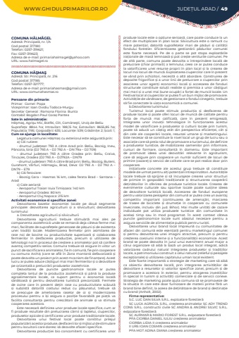 WWW.GHIDULPRIMARIILOR.RO JUDE%u021aUL ARAD / 49COMUNA H%u0102LM%u0102GELAdres%u0103: Principal%u0103, nr. 1/ACod po%u0219tal: 317180Telefon: 0257-319621; Fax: 0257-319623; Adresa de e-mail: primariahalmagel@yahoo.comURL: www.halmagel.roCOMUNA H%u0102%u015eMA%u015e Adres%u0103: Str. Principal%u0103, nr. 216Cod po%u0219tal: 317185Telefon: 0257-321777; Adresa de e-mail: primariahasmas@gmail.comURL: www.comunahasmas.roPersoane din primarie:Primar:%u00a0 Cornel%u00a0%u00a0PopaViceprimar: Ioan Ovidiu%u00a0Todoca-MurguSecretar General :%u00a0Ramona Florina%u00a0%u00a0BuntaContabil: Bogdan Paul%u00a0Cora%u0219 Pantea%u00a0Sate %u00een administra%u021bie:H%u0103%u015fma%u015f, Agri%u015fu%u00a0Mic, Botfei, Clit, Com%u0103ne%u015fti, Urvi%u015f de BeliuSuprafa%u021ba:%u00a0 8844 ha; Intravilan:%u00a0 188,15 ha; Extravilan:%u00a0 8655,85 ha; Popula%u021bia:%u00a01195; Gospod%u0103rii:%u00a0635; Locuin%u021be:%u00a0539; Gr%u0103dini%u021be:%u00a02; %u0218coli:%u00a01; Cum se ajunge in localitate:Legatura comunei H%u0103%u0219ma%u0219%u00a0cu exteriorul este asigurat%u0103%u00a0prin:a) C%u0103i rutiere:-%u00a0drumul jude%u021bean 793 A c%u0103tre Arad prin Beliu, Bocsig, Ineu, P%u00e2ncota, Siria (DJ 793 A %u2013 DJ 792 A %u2013 DN 79a %u2013 DJ 709)-%u00a0 drumul jude%u021bean 793 A c%u0103tre Oradea prin: Beliu, Craiva, Tinca,les, Oradea (DJ 793 A %u2013 DJ792A %u2013 DN79-%u00a0drumul jude%u021bean 793 A c%u0103tre Brad prin: Beliu, Bocsig, Buteni, Gurahont, V%u00e2rfuri, H%u0103lmagiu, Brad, Deva: DJ 793 A - DJ 792 A %u2013 DN79 %u2013 E79b) C%u0103i feroviare:-%u00a0Bocsig Gara %u2013 Hasmas 16 km, calea ferata Brad %u2013 Santana %u2013 Aradc) Cale aerian%u0103:-%u00a0Aeroportul Traian Vuia Timi%u0219oara: 140 km-%u00a0Aeroportul Oradea: 80 km -%u00a0Aeroportul Cluj Napoca: 215 kmActivitati economice si specifice zonei:Dezvoltarea bazelor economiei locale pe dou%u0103 segmente principale: dezvoltarea agriculturii %u0219i a silviculturii; dezvoltarea turismuluia. Dezvoltarea agriculturii %u0219i silviculturiiDezvoltarea agriculturii trebuie stimulat%u0103 mai ales pe componenta zootehnic%u0103 unde se remarc%u0103 deja c%u00e2teva ferme mai mari, facilitate de suprafe%u021bele generoase de p%u0103%u0219uni %u0219i de existen%u021ba unei tradi%u021bii locale. Modernizarea fermelor prin asimilarea de rase noi de bovine cu productivitate superioar%u0103 %u0219i colaborarea fermierilor %u00een desfacerea produc%u021biei, precum %u0219i utilizarea de tehnologii noi %u00een procesul de cre%u0219tere a animalelor pot s%u0103 confere avantaj competitiv serios. Comuna trebuie s%u0103 asigure %u00een viitor un punct de sacrificare a animalelor, fie %u00een comun%u0103, fie prin cooperare cu comuna Archi%u0219 (care se afl%u0103 %u00een Zona montan%u0103 defavorizat%u0103 %u0219i poate dezvolta un proiect prin acest mcanism de finan%u021bare). Acest lucru ar putea aduce c%u00e2%u0219tiguri mai mari fermierilor %u0219i o dezvoltare pe orizontal%u0103 a prelucr%u0103rii produselor zootehnice.Dezvoltarea de puncte gastronomice locale ar putea completa lan%u021bul de la produc%u021bia zootehnic%u0103 %u0219i p%u00e2n%u0103 la produse agroalimentare locale, ca suport pentru o economie local%u0103 s%u0103n%u0103toas%u0103 %u0219i pentru dezvoltarea turistic%u0103 preconizat%u0103. Fermele de ovine care %u00een prezent de%u021bin rase cu productivitate sc%u0103zut%u0103 %u0219i subzist%u0103 datorit%u0103 costului redus cu p%u0103%u0219unatul, trebuie s%u0103 se preocupe de ameliorarea raselor de oi %u0219i modernizarea procesului pentru a %u00ee%u0219i asigura o pozi%u021bie favorabil%u0103 pe pia%u021b%u0103. va facilita consultan%u021ba pentru cresc%u0103torii de animale %u0219i va stimula cooperarea acestora.Este necesar%u0103 definirea unor produse locale specifice, cum ar fi produse rezultate din prelucrarea c%u0103rnii %u0219i laptelui, ciupercilor, produselor apicole %u0219i certificarea unor produse tradi%u021bionale locale.Dezvoltarea unui festival local poate constitui prilejul populariz%u0103rii acestor produse, desfacerii lor %u0219i mijlocul de stimulare pentru locuitorii care doresc s%u0103 dezvolte afaceri specifice.Dezvoltarea produc%u021biei bio concomitent cu certificarea unor produse locale este o op%u021biune serioas%u0103, care poate conduce la un efect de multiplicare %u00een plan local. Silvicultura este o ramur%u0103 cu mare poten%u021bial, datorit%u0103 suprafe%u021belor mari de p%u0103duri %u0219i calit%u0103%u021bii fondului forestier. Eficientizarea gestion%u0103rii p%u0103durilor comunei este foarte necesar%u0103. Pe de o parte se pot stopa exploat%u0103rile ira%u021bionale de mas%u0103 lemnoas%u0103 %u0219i pot cre%u0219te veniturile comunei. Pe de alt%u0103 parte, comuna poate dezvolta o %u00eentreprindere local%u0103 de prelucrare (chiar primar%u0103) a lemnului, ceea ce ar putea conduce la valorificarea unei resurse proprii %u00een plan local %u0219i la crearea de locuri noi locuri de munc%u0103. Exploatarea ciupercilor care %u00een prezent se v%u00e2nd prin achizitori, necesit%u0103 o alt%u0103 abordare. Construirea de depozite frigorifice %u0219i a unor linii de prelucrare a ciupercilor prin asocierea unor agen%u021bi economici locali %u0219i accesarea de fonduri structurale constituie solu%u021bii realiste %u0219i premisa a unor c%u00e2%u0219tiguri mai mari %u0219i a unei mai bune ocup%u0103ri a for%u021bei de munc%u0103 locale. Un Festival local al ciupercilor ar putea fi un bun mijloc de promovare. Activit%u0103%u021bile de v%u00e2n%u0103toare, de gestionare a fondul cinegetic, trebuie s%u0103 fie conectate la via%u021ba economic%u0103 a comunei.b.Dezvoltarea turismuluiTurismul local poate stimula produc%u021bia %u0219i desfacerea de produse locale %u0219i poate oferi locuri de munc%u0103 de calitate pentru for%u021ba de munc%u0103 mai calificat%u0103, care %u00een prezent emigreaz%u0103. Integrarea unor inova%u021bii tehnologice %u00een func%u021bionarea acestui model de va