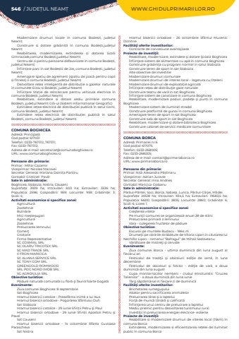 546 / JUDE%u021aUL NEAM%u021a WWW.GHIDULPRIMARIILOR.ROModernizare drumuri locale %u00een comuna Bode%u0219ti, jude%u021bul Neam%u021bConstruire %u0219i dotare gr%u0103dini%u021b%u0103%u00a0 %u00een comuna Bode%u0219ti,jude%u021bul Neam%u021bReabilitarea, modernizarea, extinderea %u0219i dotarea %u0218colii Gimnaziale,comuna Bode%u0219ti,jude%u021bul Neam%u021bCentru de zi pentru persoane defavorizate %u00een comuna Bode%u0219ti, jude%u021bul Neam%u021b%u00cenfiin%u021bare parc %u00een sat Bode%u0219tii de Jos, comuna Bode%u0219ti, jude%u021bul Neam%u021bAmenajare spa%u021biu de agrement (spa%u021biu de joac%u0103%u00a0pentru copii %u0219i fitness) i%u00ee comuna Bode%u0219ti, jude%u021bul Neam%u021bDezvoltare re%u021bea inteligent%u0103 de distribu%u021bie a gazelor naturale %u00een comunele Girov %u0219i Bode%u0219ti, jude%u021bul Neam%u021b%u00cenfiin%u021bare Sta%u021bie de re%u00eenc%u0103rcare pentru vehicule electrice %u00een comuna Bode%u0219ti, jude%u021bul Neam%u021b Reabilitare, extindere %u0219i dotare sediu prim%u0103rie comuna Bode%u0219ti, jude%u021bul Neam%u021b GIS-ul (Sistem Informational Geografic)Extindere re%u021bea electric%u0103 de distribu%u021biei public%u0103 %u00een satul Corni, comuna Bode%u0219ti, jude%u021bul Neam%u021b Extindere re%u021bea electric%u0103 de distribu%u021biei public%u0103 %u00een satul Bode%u0219ti, comuna Bode%u0219ti, jude%u021bul Neam%u021bCOMUNA BOGHICEAAdres%u0103: Principal%u0103Cod po%u0219tal: 617031Telefon: 0233-767312, 767311; Fax: 0233-767312; Adresa de e-mail: secretariat@comunaboghicea.roURL: www.comunaboghicea.roPersoane din primarie:Primar:%u00a0 Mihai%u00a0CazamirViceprimar: Nicolae MacoveiSecretar General: Mariana Doini%u021ba Pan%u021biruContabil: Cristinel%u00a0%u00a0Pav%u0103l%u00a0Sate %u00een administra%u021bie:Boghicea, Slobozia, Nistria, C%u0103u%u015feniSuprafa%u021ba:%u00a0 3939 ha; Intravilan:%u00a0 603 ha; Extravilan:%u00a0 3336 ha; Popula%u021bia:%u00a0 2596; Gospod%u0103rii:%u00a0 959; Locuin%u021be:%u00a0 959; Gr%u0103dini%u021be:%u00a0 3; %u0218coli:%u00a04; Activitati economice si specifice zonei:Agricultur%u0103ZootehnieButn%u0103rieMici me%u015fte%u015fugariAgricultur%u0103ZootehniePrelucrarea lemnuluiComer%u0163CroitorieFirme ReprezentativeSC COSMIAL SRLSC OLARU TRICOTEX SRLSC MAD TRADE SRLII FRON MARICICASC ALIANA SERVICE SRLSC TONY COM SRLGREENGOLD ROMWOOD SRL PDC NORD IMOB SRL SC AGROIULIA SRL%u00a0Obiective turistice:P%u0103dure natural%u0103 comunal%u0103 cu flor%u0103 %u015fi faun%u0103 foarte bogat%u0103Evenimente:Ziua comunei Boghicea: 8 septembrieSat BoghiceaHramul bisericii catolice - Preasf%u00e2nta Inim%u0103 a lui IsusHramul bisericii ortodoxe - Pogor%u00e2rea Sf%u00e2ntului DuhSat SloboziaHramul bisericii catolice - 29 iunie Sfin%u021bii Petru %u015fi PaulHramul bisericii ortodoxe - 29 iunie Sfin%u021bii Apostoli Petru %u015fi PavelSat CauseniHramul bisericii ortodoxe - 14 octombrie Sf%u00e2nta Cuvioasa ParaschevaSat Nistria Hramul bisericii ortodoxe - 26 octombrie Sf%u00e2ntul Mucenic DimitrieFacilit%u00e3%u0163i oferite investitorilor:Contracte de concesiune avantajoaseProiecte de investi%u0163ii:Reabilitare, modernizare, extindere %u015fi dotare %u015ecoala Boghicea%u00cenfiin%u0163are sistem de alimentare cu ap%u0103 %u00een comuna BoghiceaConstruire gr%u0103dini%u021ba cu program normal %u00een satul SloboziaConstruire teren de sport %u00een sat SloboziaAlte obiective de investitieModernizare drumuri comunaleModernizare drumuri de interes local %u2013 legatura cu O%u021beleniModernizare drumuri de exploata%u0163ie agricol%u0103%u00cenfiin%u0163are re%u021bea de distribu%u0163ie gaze naturaleConstruire teatru de var%u0103 %u00een sat Boghicea%u00cenfiin%u0163are sistem de canalizare %u00een comuna BoghiceaReabilitare, modernizare poduri, pode%u0163e %u015fi pun%u021bi %u00een comuna Boghicea Modernizare sistem de iluminat stradal Construire platform%u0103 de gunoi %u00een comuna BoghiceaAmenajare teren de sport %u00een sat BoghiceaConstruire sala de sport %u00een sat BoghiceaReabilitare, modernizare %u015fi dotare biblioteca Boghicea Construire cabinet de servicii medicale comunitareCOMUNA BORCAAdres%u0103: Primariei nr.6Cod po%u0219tal: 617075Telefon: 0233-268005; Fax: 0233-268005; Adresa de e-mail: contact@primariaborca.roURL: www.primariaborca.roPersoane din primarie:Primar:%u00a0Ni%u021b%u0103 Alexandra P%u0103%u0219tinaruViceprimar: Adrian JuravleSecretar General:%u00a0Irina Andrie%u0219Contabil:%u00a0Maricica%u00a0Ciobanu%u00a0Sate %u00een administra%u021bie:P%u00e2r%u00e2ul-P%u00e2ntei,%u00a0Soci,%u00a0Borca, Sabasa,%u00a0Lunca, P%u00e2r%u00e2ul-C%u00e2rjei,%u00a0M%u0103deiSuprafa%u021ba:%u00a0 20518 ha; Intravilan:%u00a0 934,5 ha; Extravilan:%u00a0 19583,5 ha; Popula%u021bia:%u00a0 6600; Gospod%u0103rii:%u00a0 2835; Locuin%u021be:%u00a0 2860; Gr%u0103dini%u021be:%u00a0 6; %u0218coli:%u00a06; Licee:%u00a01; Activitati economice si specifice zonei:Cre%u015fterea vitelorPe mun%u0163ii comunei se organizeaz%u0103 anual 28 de st%u00e2niPrelucrarea primar%u0103 a lemnuluiVara - culegerea fructelor de p%u0103dure%u00a0Obiective turistice:Excursii pe muntele Budacu - 1864 mDrume%u0163ii pe c%u0103r%u0103rile str%u0103b%u0103tute de Vitoria Lipan %u00een c%u0103utarea lui Nechifor Lipan - romanul %u201cBaltagul%u201d de Mihail SadoveanuV%u00e2n%u0103toare de mistre%u0163i %u015fi cervideEvenimente:Ziua comunei Borca - ultima duminic%u0103 din luna august al fiec%u0103rui anFestivalul de tradi%u0163ii %u015fi obiceiuri: edi%u0163ie de iarn%u0103, %u00een luna decembrieFestivalul de obiceiuri %u015fi folclor - edi%u0163ie de var%u0103, a doua duminic%u0103 din luna augustCupa montarniazilor nem%u0163eni - clubul etnoturistic %u201cCrucea Talienilor%u201d - a doua duminic%u0103 din luna iunieT%u00e2rg s%u0103pt%u0103m%u00e2nal %u00een fiecare zi de duminic%u0103Facilit%u00e3%u0163i oferite investitorilor:Brichetarea rumegu%u015fuluiAbator pentru sacrificarea animalelorPrelucrarea l%u00e2nei %u