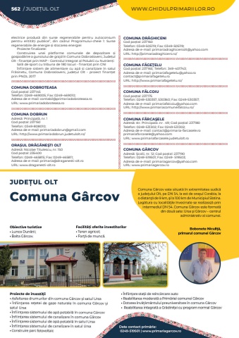 562 / JUDE%u021aUL OLT WWW.GHIDULPRIMARIILOR.ROelectrice produs%u0103 din surse regenerabile pentru autoconsum pentru entit%u0103%u021bi publice%u201d, din cadrul Programului-cheie 1: Surse regenerabile de energie %u0219i stocarea energieiProiecte finalizate:Construirea unei platforme comunale de depozitare %u0219i gospod%u0103rire a gunoiului de grajd %u00een Comuna Dobrosloveni, Jude%u021bul Olt - finan%u021bat prin MAP - Controlul Integrat al Polu%u0103rii cu Nutrien%u021biSal%u0103%u00a0de sport cu tribuna de 180 locuri - finan%u021bat prin CNI%u00cenfiin%u021bare sistem de alimentare cu ap%u0103%u00a0 %u0219i canalizare %u00een satul Fr%u0103sinetu, Comuna Dobrosloveni, jude%u021bul Olt - proiect finan%u021bat prin PNDL 2017COMUNA DOBROTEASACod po%u0219tal: 237145Telefon: 0249-469005; Fax: 0249-469010; Adresa de e-mail: contabil@primariadobroteasa.roURL: www.primariadobroteasa.roCOMUNA DOBRUNAdres%u0103: Principal%u0103, nr. 1Cod po%u0219tal: 237150Telefon: 0349-808010; Adresa de e-mail: primariadobrun@gmail.comURL: http://www.primariadobrun.judetulolt.ro/ORA%u0218UL DR%u0102G%u0102NE%u015eTI OLTAdres%u0103: Nicolae Titulescu, nr. 150Cod po%u0219tal: 235400Telefon: 0249-465815; Fax: 0249-465811; Adresa de e-mail: primaria@draganesti-olt.roURL: www.draganesti-olt.roCOMUNA DR%u0102GHICENICod po%u0219tal: 237160Telefon: 0349-505119; Fax: 0349-505119; Adresa de e-mail: primariadraghiceniolt@yahoo.comURL: http://primariadraghiceni.ro/COMUNA F%u0102GE%u0162ELUCod po%u0219tal: 237165; Telefon: 349-401743; Adresa de e-mail: primariafagetelu@yahoo.rocontact@primariafagetelu.roURL: http://www.primariafagetelu.ro/COMUNA F%u0102LCOIUCod po%u0219tal: 237175Telefon: 0249-530357, 530360; Fax: 0249-530357; Adresa de e-mail: primariafalcoiu@yahoo.comURL: http://www.primariacomuneifalcoiu.ro/COMUNA F%u0102RCA%u015eELEAdres%u0103: str. Principala .nr . 49; Cod po%u0219tal: 237180Telefon: 0249-531302; Fax: 0249-531302; Adresa de e-mail: contact@primaria-farcasele.roprimariafarcasele@yahoo.comURL: www.primariafarcasele.judetulolt.roCOMUNA G%u00c2RCOVAdres%u0103: %u015ecolii, nr. 12; Cod po%u0219tal: 237190Telefon: 0249-519501; Fax: 0249- 519503; Adresa de e-mail: primariagarcov@yahoo.comURL: www.primariagarcov.ro