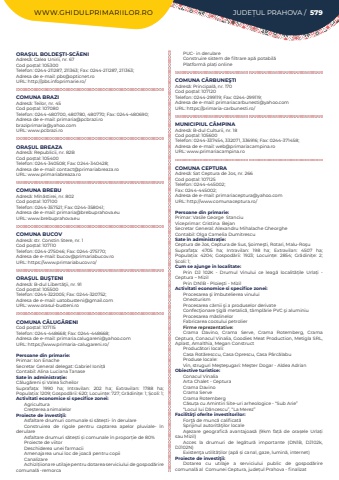 WWW.GHIDULPRIMARIILOR.RO JUDE%u021aUL PRAHOVA / 579ORA%u0218UL BOLDE%u015eTI-SC%u0102ENIAdres%u0103: Calea Unirii, nr. 67Cod po%u0219tal: 105300Telefon: 0244-211287, 211363; Fax: 0244-211287, 211363; Adresa de e-mail: pbs@opticnet.roURL: http://pbs.infoprimarie.ro/COMUNA BRAZIAdres%u0103: Teilor, nr. 45Cod po%u0219tal: 107080Telefon: 0244-480700, 480780, 480770; Fax: 0244-480690; Adresa de e-mail: primaria@pcbrazi.robraziprimaria@yahoo.comURL: www.pcbrazi.roORA%u0218UL BREAZAAdres%u0103: Republicii, nr. 82BCod po%u0219tal: 105400Telefon: 0244-340508; Fax: 0244-340428; Adresa de e-mail: contact@primariabreaza.roURL: www.primariabreaza.roCOMUNA BREBUAdres%u0103: M%u00een%u0103stirei, nr. 802Cod po%u0219tal: 107100Telefon: 0244-357521; Fax: 0244-358041; Adresa de e-mail: primaria@brebuprahova.euURL: www.brebuprahova.euCOMUNA BUCOVAdres%u0103: str. Constin Stere, nr. 1Cod po%u0219tal: 107110Telefon: 0244-275046; Fax: 0244-275170; Adresa de e-mail: bucov@primariabucov.roURL: https://www.primariabucov.ro/ORA%u0218UL BU%u015eTENIAdres%u0103: B-dul Libert%u0103%u0163ii, nr. 91Cod po%u0219tal: 105500Telefon: 0244-322005; Fax: 0244-320752; Adresa de e-mail: uatobusteni@gmail.comURL: www.orasul-busteni.roCOMUNA C%u0102LUG%u0102RENICod po%u0219tal: 107115Telefon: 0244-448668; Fax: 0244-448668; Adresa de e-mail: primaria.calugareni@yahoo.comURL: https://www.primaria-calugareni.ro/Persoane din primarie:Primar: Ion EnacheSecretar General delegat: Gabriel Ioni%u021b%u0103Contabil: Alina Luciana TanaseSate %u00een administra%u021bie:C%u0103lug%u0103reni %u0219i Valea ScheilorSuprafa%u021ba:%u00a0 1990 ha; Intravilan:%u00a0 202 ha; Extravilan:%u00a0 1788 ha; Popula%u021bia:%u00a01209; Gospod%u0103rii:%u00a0620; Locuin%u021be:%u00a0727; Gr%u0103dini%u021be:%u00a01; %u0218coli:%u00a01; Activitati economice si specifice zonei:AgriculturaCre%u0219terea animalelor%u00a0Proiecte de investi%u0163ii:Asfaltare drumuri comunale si s%u0103te%u0219ti- %u00een derulareConstruirea de rigole pentru captarea apelor pluviale- %u00een derulareAsfaltare drumuri s%u0103te%u0219ti %u0219i comunale %u00een propor%u021bie de 80%Proiecte de viitorDeschiderea unei farmaciiAmenajarea unui loc de joac%u0103%u00a0pentru copii CanalizareAchizi%u021biionare utilaje pentru dotarea serviciului de gospod%u0103rire comunal%u0103%u00a0-remorcaPUC- in derulareConstruire sistem de filtrare ap%u0103%u00a0potabil%u0103Platform%u0103%u00a0pla%u021bi online%u00a0COMUNA C%u0102RBUNE%u015eTIAdres%u0103: Principal%u0103, nr. 170Cod po%u0219tal: 107120Telefon: 0244-299119; Fax: 0244-299119; Adresa de e-mail: primariacarbunesti@yahoo.comURL: https://primaria-carbunesti.ro/MUNICIPIUL C%u00c2MPINAAdres%u0103: B-dul Culturii, nr. 18Cod po%u0219tal: 105600Telefon: 0244-337454, 332071, 336916; Fax: 0244-371458; Adresa de e-mail: web@primariacampina.roURL: www.primariacampina.roCOMUNA CEPTURAAdres%u0103: Sat Ceptura de Jos, nr. 266Cod po%u0219tal: 107125Telefon: 0244-445002; Fax: 0244-445002; Adresa de e-mail: primariaceptura@yahoo.comURL: http://www.comunaceptura.ro/Persoane din primarie:Primar: Vasile George%u00a0%u00a0Stanciu%u00a0Viceprimar:%u00a0Cristina%u00a0%u00a0Bejan%u00a0Secretar General: Alexandru Mihalache%u00a0GheorgheContabil: Olga Camelia DumitrescuSate %u00een administra%u021bie:Ceptura de Jos, Ceptura de Sus, %u015eoime%u015fti, Rotari, Malu-Ro%u015fuSuprafa%u021ba:%u00a0 4705 ha; Intravilan:%u00a0 198 ha; Extravilan:%u00a0 4507 ha; Popula%u021bia:%u00a0 4204; Gospod%u0103rii:%u00a0 1923; Locuin%u021be:%u00a0 2854; Gr%u0103dini%u021be:%u00a0 2; %u0218coli:%u00a01; Cum se ajunge in localitate:Prin DJ 102K - Drumul Vinului ce leag%u0103 localit%u0103%u021bile Urla%u021bi - Ceptura %u2013 Mizil Prin DN1B - Ploie%u015fti - MizilActivitati economice si specifice zonei:Procesarea %u015fi %u00eembutelierea vinuluiOneoturismProcesarea c%u0103rnii %u015fi a produselor derivateConfec%u0163ionare %u0163igl%u0103 metalic%u0103, t%u00e2mpl%u0103rie PVC %u015fi aluminiuProcesarea m%u0103slinelorFabricarea cocsului petrolierFirme reprezentative:Crama Davino, Crama Serve, Crama Rotemberg, Crama Ceptura, Conacul Vinalia, Goodies Meat Production, Metigla SRL, Aplast, Amalthia, Megan Construct Produc%u0103tori locali:Casa Rot%u0103resccu, Casa Oprescu, Casa P%u00e2rc%u0103labuProduse locale: Vin, struguri Me%u015fte%u015fugari: Me%u015fter Dogar - Aldea AdrianObiective turistice:Conacul VinaliaArta Chalet - CepturaCrama DavinoCrama ServeCrama RotembergC%u0103su%u021ba cu Amintiri Site-uri arheologice - %u201cSub Arie%u201d %u201cLocul lui D%u0103ncescu%u201d, %u201cLa Merez%u201dFacilit%u00e3%u0163i oferite investitorilor:For%u0163%u0103 de munc%u0103 calificat%u0103Sprijinul autorit%u0103%u0163ilor localeA%u015fezare geografic%u0103 avantajoas%u0103 (9km fa%u021b%u0103 de ora%u0219ele Urla%u021bi sau Mizil)Acces la drumuri de leg%u0103tur%u0103 importante (DN1B, DJ102k, DJ102N) Existen%u0163a utilit%u0103%u021bilor (ap%u0103 %u0219i canal, gaze, lumin%u0103, internet)Proiecte de investi%u0163ii:Dotarea cu utilaje a serviciului public de gospod%u0103rire comunal%u0103%u00a0al%u00a0 Comunei Ceptura, jude%u021bul Prahova - finalizat