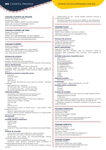 582 / JUDE%u021aUL PRAHOVA WWW.GHIDULPRIMARIILOR.ROCOMUNA FILIPE%u015eTII DE P%u0102DUREAdres%u0103: Valea Rea, nr. 343-344Cod po%u0219tal: 107245Telefon: 0244-386801, 386172; Fax: 0244-386094; Adresa de e-mail: primariafp@gmail.comURL: www.filipestiidepadure.roCOMUNA FILIPE%u015eTII DE T%u00c2RGAdres%u0103: Cuza Vod%u0103, nr. 718Cod po%u0219tal: 107250Telefon: 0244-389489,389208 ; Fax: 0244-389599; Adresa de e-mail: primariafilipestiidetarg@yahoo.comURL: https://www.primariafilipestiidetarg.ro/COMUNA FLORE%u015eTIAdres%u0103: Principal%u0103, nr. 604Cod po%u0219tal: 107255Telefon: 0244-369502,369114; Fax: 0244-362161; Adresa de e-mail: floresti_primaria@yahoo.comURL: https://florestiprahova.ro/Persoane din primarie:Primar: Simona DavidViceprimar: Angela MarinSecretar General: Ioana Ruxandra BucurInspector Compartiment Buget-Finan%u0163e: Nicoleta Cristina SanduSate %u00een administra%u021bie:Flore%u015fti, Cap Ro%u015fu, C%u0103line%u015fti, C%u0103tina, Novace%u015ftiSuprafa%u021ba:%u00a0 5489 ha; Intravilan:%u00a0 2526 ha; Extravilan:%u00a0 2963 ha; Popula%u021bia:%u00a0 7742; Gospod%u0103rii:%u00a0 2445; Locuin%u021be:%u00a0 2505; Gr%u0103dini%u021be:%u00a0 3; %u0218coli:%u00a03; Activitati economice si specifice zonei:IndustrieExtrac%u0163ie petrolComer%u0163Agricultur%u0103SC. Michelin Rom%u00e2nia SA. punct de lucru Flore%u0219ti - Confec%u021bii anvelopeOMV Petrom SA - Extrac%u021bieMD Petroserv SRL - Activit%u0103%u021bi de extrac%u021bieSC. Confind%u00a0Impex SRL. - Construc%u021bii civileSC Smart Food Solution SRL - Panifica%u021bieObiective turistice:Ansamblul cur%u021bii boiere%u0219ti Mavros CantacuzinoConacul Mavros Cantacuzino din C%u0103line%u0219tiCapela Romano Catolic%u0103Curtea lui Gheorghe Grigore Cantacuzino NababulPalatul %u201cMicul Trianon%u201d Flore%u015ftiTurn de ap%u0103ParcZid de incint%u0103Monumentul funerar%u00a0 al Mariei %u0218u%u021bu - Grup Statuar %u201cFata pans%u00e2nd un r%u0103nit%u201dBiserica %u201cAdormirea Maicii Domnului%u201dBiserica %u201cSf%u00e2nta Treime%u201d Na%u0219terea Domnului cu cripta familiei vornicul Grigore CantacuzinoEvenimente:Zilele localit%u0103%u021bii - 21 maiFacilit%u00e3%u0163i oferite investitorilor:Acces la DN 1Ap%u0103 curent%u0103CanalElectricitateAcces la CF Bucure%u015fti-Bra%u015fov %u015fi Autostrada Bucure%u015fti-Bra%u015fovBor%u015fProiecte de investi%u0163ii:Construirea unei cre%u0219e moderne %u00een comuna Flore%u0219tiConstruirea unui c%u0103min cultural %u00een satul Cap Ro%u0219uConstruirea unui spital de Pneumoftiziologie (Planul Urbanistic Zonal a fost finalizat)Finalizarea construirii gr%u0103dini%u021bei cu program prelungit%u00cenfiin%u021bare sta%u021bie epurare, extindere re%u021bea canalizare %u0219i modernizarea sistemului de alimentare cu ap%u0103Modernizarea por%u021biunii din DJ 720 care str%u0103bate comuna Flore%u0219tiModernizarea DJ 144 - strada Nedelii: %u00eenfiin%u021bare trotuare %u0219i turnare covor asfaltic%u00cenfiin%u021bare trotuare %u0219i turnare covor asfaltic %u00een satul Nov%u0103ce%u0219ti Amenajare parc %u0219i loc de joac%u0103 %u00een zona Palatului CantacuzinoCOMUNA FULGA Adres%u0103: Principal%u0103 2 nr.83Cod po%u0219tal: 107260Telefon: 0244-449000 ; Fax: 0244-449000; Adresa de e-mail: primaria_fulga@yahoo.comURL: primariafulga.roPersoane din primarie:Primar: Serban Silviu NicolaeViceprimar: Neac%u0219u IulianSecretar: Potec DanielaContabil: Voiculescu NicolaeSate %u00een administra%u021bie:Fulga de Sus, Fulga de JosSuprafa%u021ba:%u00a0 360 ha; Intravilan:%u00a0 360 ha; Extravilan:%u00a0 7456 ha; Popula%u021bia:%u00a0 3138; Gospod%u0103rii:%u00a0 1475; Locuin%u021be:%u00a0 1401; Gr%u0103dini%u021be:%u00a0 2; %u0218coli:%u00a02; Activitati economice si specifice zonei:Agricultur%u0103Piscicultur%u0103Prelucrarea lapteluiFirme reprezentative:SC ZOEGAB SRLSC LIBERTATEA SASC PISCICOLA - FULGASC FLORA SAProduse locale:Pe%u0219teLapteCerealeObiective turistice:Bisericile din localitateEvenimente:Ziua localit%u0103%u021bii - Sf%u00e2ntul Pantelimon - 27 iulieFacilit%u00e3%u0163i oferite investitorilor:TerenuriCerealeLocuin%u021beProiecte de investi%u0163ii:Introducere gaze naturale %u00een comuna Fulga, jude%u021bul PrahovaReabilitare drumuri locale%u00cen derulare :%u00cenfiin%u021bare re%u021bea de canalizare %u00een sistem centralizat %u00een comuna Fulga, jude%u021bul Prahova, satele: Fulga de Sus %u0219i Fulga de JosRealizare racorduri la canalizare menajer%u0103%u00a0%u00een comuna Fulga, jude%u021bul PrahovaCOMUNA GHERGHI%u0162AAdres%u0103: Principal%u0103, FNCod po%u0219tal: 107265Telefon: 0244-474662, 474663; Fax: 0244-474662; Adresa de e-mail: primaria_gherghita@yahoo.comURL: www.primariacomuneigherghita.roCOMUNA GORGOTAAdres%u0103: Principal%u0103, nr. 70Cod po%u0219tal: 107275Telefon: 0244-474511, 474041; Fax: 0244- 474511; Adresa de e-mail: primar@primariagorgota.roURL: https://www.primariagorgota.ro/COMUNA GORNETCod po%u0219tal: 107285Telefon: 0244-419251; Fax: 0244-419251; Adresa de e-mail: primariagornet@yahoo.comURL: http://www.primariagornet.ro/