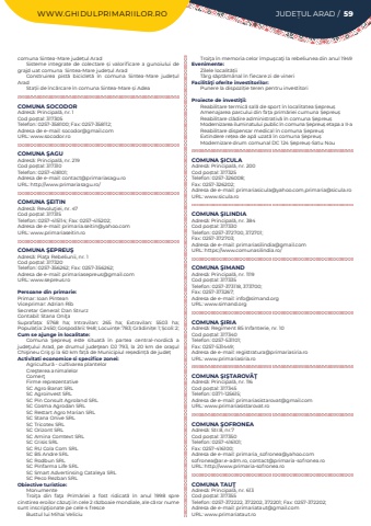 WWW.GHIDULPRIMARIILOR.RO JUDE%u021aUL ARAD / 59comuna Sintea-Mare jude%u021bul AradSisteme integrate de colectare %u0219i valorificare a gunoiului de grajd%u00a0uat comuna%u00a0 Sintea-Mare jude%u021bul AradConstruirea pist%u0103%u00a0 biciclet%u0103%u00a0 %u00een comuna Sintea-Mare jude%u021bul AradSta%u021bii de %u00eenc%u0103rcare %u00een comuna Sintea-Mare %u0219i AdeaCOMUNA SOCODORAdres%u0103: Principal%u0103, nr. 1Cod po%u0219tal: 317305Telefon: 0257-358100; Fax: 0257-358112; Adresa de e-mail: socodor@gmail.comURL: www.socodor.roCOMUNA %u015eAGUAdres%u0103: Principal%u0103, nr. 219Cod po%u0219tal: 317310Telefon: 0257-418101; Adresa de e-mail: contact@primariasagu.roURL: http://www.primariasagu.ro/COMUNA %u015eEITINAdres%u0103: Revolu%u0163iei, nr. 47Cod po%u0219tal: 317315Telefon: 0257-415114; Fax: 0257-415202; Adresa de e-mail: primaria.seitin@yahoo.comURL: www.primariaseitin.roCOMUNA %u015eEPREU%u015e Adres%u0103: Pia%u0163a Rebeliunii, nr. 1Cod po%u0219tal: 317320Telefon: 0257-356262; Fax: 0257-356262; Adresa de e-mail: primariasepreus@gmail.comURL: www.sepreus.roPersoane din primarie:Primar: Ioan PinteanViceprimar: Adrian R%u00eebSecretar General: Dan StrurzContabil: Stana Oni%u0163aSuprafa%u021ba:%u00a0 5768 ha; Intravilan:%u00a0 265 ha; Extravilan:%u00a0 5503 ha; Popula%u021bia:%u00a02450; Gospod%u0103rii:%u00a0948; Locuin%u021be:%u00a0783; Gr%u0103dini%u021be:%u00a01; %u0218coli:%u00a02; Cum se ajunge in localitate:Comuna %u015eepreu%u015f este situat%u0103 %u00een partea central-nordic%u0103 a jude%u0163ului Arad, pe drumul jude%u0163ean DJ 793, la 20 km de ora%u015ful Chi%u015fineu Cri%u015f %u015fi la 60 km fa%u021b%u0103 de Municipiul re%u0219edin%u021b%u0103 de jude%u021bActivitati economice si specifice zonei:Agricultur%u0103 - cultivarea plantelorCre%u015fterea animalelorComer%u0163Firme reprezentativeSC Agro Banat SRLSC Agroinvest SRLSC Pin Consult Agroland SRLSC Cosma Agrodan SRLSC Restart Agro Marian%u00a0SRLSC Stana Onive SRLSC Tricotex SRLSC Orizont SRLSC Amina Comtext SRLSC Crisis SRLSC RU Cola Com SRLSC BS Andre SRL SC Rodbun SRLSC Pinfarma Life SRLSC Smart Advertinsing Cataleya SRLSC Peco Rezban SRLObiective turistice:MonumenteTroi%u0163a din fa%u0163a Prim%u0103riei a fost ridicat%u0103 %u00een anul 1998 spre cinstirea eroilor c%u0103zu%u0163i %u00een cele 2 r%u0103zboaie mondiale, ale c%u0103ror nume sunt inscrip%u0163ionate pe cele 4 fresceBustul lui Mihai VeliciuTroi%u0163a %u00een memoria celor %u00eempu%u015fca%u0163i la rebeliunea din anul 1949Evenimente:Zilele localit%u0103%u021bii%u00a0T%u00e2rg s%u0103pt%u0103m%u00e2nal %u00een fiecare zi de vineriFacilit%u00e3%u0163i oferite investitorilor:Punere la dispozi%u021bie teren pentru investitoriProiecte de investi%u0163ii:Reabilitare termic%u0103 sal%u0103 de sport %u00een localitatea %u0218epreu%u0219Amenajarea parcului din fa%u021ba prim%u0103riei cumuna %u0218epreu%u0219Reabilitare cl%u0103dire administrativ%u0103 %u00een comuna %u0218epreu%u0219Modernizarea iluminatului public %u00een comuna %u0218epreu%u0219 etapa a II-aReabilitare dispensar medical %u00een comuna %u0218epreu%u0219Extindere re%u021bea de ap%u0103 uzat%u0103 %u00een comuna %u0218epreu%u0219 Modernizare drum comunal DC 124 %u0218epreu%u0219-Satu NouCOMUNA %u015eICULAAdres%u0103: Principal%u0103, nr. 200Cod po%u0219tal: 317325Telefon: 0257-326008; Fax: 0257-326202; Adresa de e-mail: primariasicula@yahoo.com,primaria@sicula.roURL: www.sicula.roCOMUNA %u015eILINDIAAdres%u0103: Principal%u0103, nr. 384Cod po%u0219tal: 317330Telefon: 0257-372700, 372701; Fax: 0257-372703; Adresa de e-mail: primariasilindia@gmail.comURL: https://www.comunasilindia.ro/COMUNA %u015eIMANDAdres%u0103: Principal%u0103, nr. 1119Cod po%u0219tal: 317335Telefon: 0257-373118, 373700; Fax: 0257-373267; Adresa de e-mail: info@simand.orgURL: www.simand.orgCOMUNA %u015eIRIAAdres%u0103: Regiment 85 Infanterie, nr. 10Cod po%u0219tal: 317340Telefon: 0257-531101; Fax: 0257-531449; Adresa de e-mail: registratura@primariasiria.roURL: www.primariasiria.roCOMUNA %u015eI%u015eTAROV%u0102%u0162Adres%u0103: Principal%u0103, nr. 116Cod po%u0219tal: 317345Telefon: 0371-125615; Adresa de e-mail: primariasistarovat@gmail.comURL: www.primariasistarovat.roCOMUNA %u015eOFRONEAAdres%u0103: Str.8, nr.7Cod po%u0219tal: 317350Telefon: 0257-416101; Fax: 0257-416100; Adresa de e-mail: primaria_sofronea@yahoo.comsofronea@ar.e-adm.ro, contact@primaria-sofronea.roURL: http://www.primaria-sofronea.roCOMUNA TAU%u0162Adres%u0103: Principal%u0103, nr. 613Cod po%u0219tal: 317355Telefon: 0257-372222, 372202, 372201; Fax: 0257-372202; Adresa de e-mail: primariataut@gmail.comURL: www.primariataut.ro