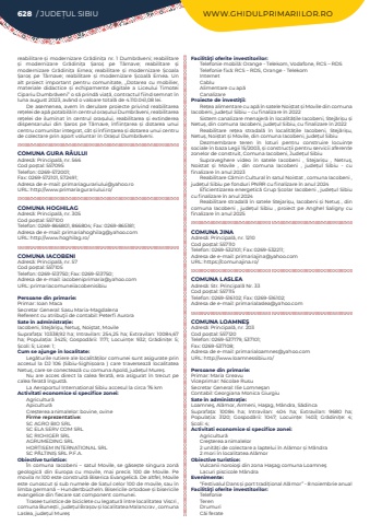 628 / JUDE%u021aUL SIBIU WWW.GHIDULPRIMARIILOR.ROreabilitare %u0219i modernizare Gr%u0103dini%u021ba nr. 1 Dumbr%u0103veni; reabilitare %u0219i modernizare Gr%u0103dini%u021ba %u0218aro%u0219 pe T%u00e2rnave; reabilitare %u0219i modernizare Gr%u0103dini%u021ba Ernea; reabilitare %u0219i modernizare %u0218coala %u0218aro%u0219 pe T%u00e2rnave; reabilitare %u0219i modernizare %u0218coal%u0103 Ernea. Un alt proiect important pentru comunitate, ,,Dotarea cu mobilier, materiale didactice %u0219i echipamente digitale a Liceului Timotei Cipariu Dumbr%u0103veni%u201d o s%u0103 prind%u0103 via%u021b%u0103, contractul fiind semnat %u00een luna august 2023, av%u00e2nd o valoare total%u0103 de 4.110.041,08 lei. De asemenea, avem %u00een derulare proiecte privind reabilitarea re%u021belei de ap%u0103 potabil%u0103 %u00een centrul ora%u0219ului Dumbr%u0103veni, reabilitarea re%u021belei de iluminat %u00een centrul ora%u0219ului, reabilitarea %u0219i extinderea dispensarului din %u0218aros pe T%u00e2rnave, %u00eenfiin%u021barea %u0219i dotarea unui centru comunitar integrat, c%u00e2t %u0219i %u00eenfiin%u021barea %u0219i dotarea unui centru de colectare prin aport voluntar %u00een Ora%u0219ul Dumbr%u0103veni.COMUNA GURA R%u00c2ULUIAdres%u0103: Principal%u0103, nr. 566Cod po%u0219tal: 557095Telefon: 0269-572001; Fax: 0269-572101, 572491; Adresa de e-mail: primariagurariului@yahoo.roURL: http://www.primariagurariului.ro/COMUNA HOGHILAGAdres%u0103: Principal%u0103, nr. 305Cod po%u0219tal: 557100Telefon: 0269-866801, 866804; Fax: 0269-865181; Adresa de e-mail: primariahoghilag@yahoo.comURL: http://www.hoghilag.ro/COMUNA IACOBENIAdres%u0103: Principal%u0103, nr. 57Cod po%u0219tal: 557105Telefon: 0269-513750; Fax: 0269-513750; Adresa de e-mail: iacobeniprimaria@yahoo.comURL: primariacomuneiiacobenisibiuPersoane din primarie:Primar: Ioan MacaSecretar General: Sasu Maria-MagdalenaReferent cu atribu%u0163ii de contabil: Peterfi AuroraSate %u00een administra%u021bie:Iacobeni, Stej%u0103ri%u015fu, Netu%u015f, Noi%u015ftat, MovileSuprafa%u021ba:%u00a010338,92 ha; Intravilan:%u00a0254,25 ha; Extravilan:%u00a010084,67 ha; Popula%u021bia:%u00a0 3425; Gospod%u0103rii:%u00a0 1171; Locuin%u021be:%u00a0 932; Gr%u0103dini%u021be:%u00a0 5; %u0218coli:%u00a05; Licee:%u00a01; Cum se ajunge in localitate:Leg%u0103turile rutiere ale localit%u0103%u021bilor comunei sunt asigurate prin accesul la DJ 106 (Sibiu-Sighi%u0219oara ) care traverseaz%u0103 localitatea Netu%u0219, care se conecteaz%u0103 cu comuna Apold, jude%u021bul Mure%u0219.Nu are acces direct la calea ferat%u0103, era asigurat %u00een trecut pe calea ferat%u0103 %u00eengust%u0103.La Aeroportul Interna%u021bional Sibiu accesul la circa 76 kmActivitati economice si specifice zonei:Agricultur%u0103 Apicultur%u0103Cre%u0219terea animalelor: bovine, ovineFirme reprezentative:SC AGRO BIO SRLSC ELA SERV COM SRLSC RICHIGER SRLAGRUMEDING SRLHORTISEM INTERNATIONAL SRL SC P%u0102LTINI%u0218 SRL P.F.A.Obiective turistice:%u00cen comuna Iacobeni %u2013 satul Movile, se g%u0103se%u0219te singura zon%u0103 geologic%u0103 din Europa cu movile, mai precis 100 de Movile. Pe movila nr.100 este construit%u0103 Biserica Evangelic%u0103. De altfel, Movile este cunoscut %u0219i sub numele de Satul celor 100 de movile, sau %u00een limba german%u0103 %u2013 Hundertb%u00fccheln. Bisericile ortodoxe %u0219i bisericile evangelice din fiecare sat component comunei.Trasee turistice de biciclete cu legatur%u0103%u00a0%u00eentre localitatea Viscri , comuna Bune%u0219ti , jude%u021bul Bra%u0219ov %u0219i localitatea Malancrav , comuna Laslea, jude%u021bul Mure%u0219Facilit%u00e3%u0163i oferite investitorilor:Telefonie mobil%u0103: Orange - Telekom, Vodafone, RCS %u2013 RDSTelefonie fix%u0103: RCS %u2013 RDS, Orange - TelekomInternetCabluAlimentare cu ap%u0103CanalizareProiecte de investi%u0163ii:Re%u021bea alimentare cu ap%u0103 %u00een satele Noi%u0219tat %u0219i Movile din comuna Iacobeni, jude%u021bul Sibiu %u2013 cu finalizare %u00een 2022Sistem canalizare menajer%u0103 %u00een localit%u0103%u021bile Iacobeni, Stej%u0103ri%u0219u %u0219i Netu%u0219, din comuna Iacobeni, jude%u021bul Sibiu, cu finalizare %u00een 2022Reabilitare re%u021bea stradal%u0103 %u00een localit%u0103%u021bile Iacobeni, Stej%u0103ri%u0219u, Netu%u0219, Noi%u0219tat %u0219i Movile, din comuna Iacobeni, jude%u021bul SibiuDezmembrare teren %u00een loturi pentru construire locuin%u021be sociale %u00een baza Legii 15/2003, %u0219i construc%u021bii pentru servicii aferente zonelor de construit, Comuna Iacobeni, Jude%u021bul SibiuSupraveghere video %u00een satele Iacobeni , Stejari%u0219u , Netru%u0219, Noistat %u0219i Movile , din comuna Iacobeni , jude%u021bul Sibiu - cu finalizare %u00een anul 2023Reabilitare C%u0103min Cultural %u00een satul Noistat , comuna Iacobeni , jude%u021bul Sibiu pe fonduri PNRR cu finalizare %u00een anul 2024Eficientizarea energetic%u0103%u00a0Grup %u0218colar Iacobeni , jude%u021bul Sibiu cu finalizare %u00een anul 2024Reabilitare stradal%u0103%u00a0%u00een satele Stejari%u0219u, Iacobeni %u0219i Netu%u0219%u00a0, din comuna Iacobeni , jude%u021bul Sibiu , proiect pe Anghel Saligny cu finalizare %u00een anul 2025COMUNA JINAAdres%u0103: Principal%u0103, nr. 1210Cod po%u0219tal: 557110Telefon: 0269-532101; Fax: 0269-532211; Adresa de e-mail: primariajina@yahoo.comURL: https://comunajina.ro/COMUNA LASLEAAdres%u0103: Str. Principal%u0103 Nr. 33Cod po%u0219tal: 557115Telefon: 0269-516102; Fax: 0269-516102; Adresa de e-mail: primarialaslea@yahoo.comCOMUNA LOAMNE%u015eAdres%u0103: Principal%u0103, nr. 203Cod po%u0219tal: 557120Telefon: 0269-537179, 537101; Fax: 0269-537108; Adresa de e-mail: primarialoamnes@yahoo.comURL: http://www.loamnessibiu.ro/Persoane din primarie:Primar: Maria GreavuViceprimar: Nicolae RusuSecretar General: Ilie Lomne%u015fanContabil: Georgiana Monica GiurgiuSate %u00een administra%u021bie:Loamne%u015f, Al%u0103mor, Armeni, Ha%u015fag, M%u00e2ndra, S%u0103dincaSuprafa%u021ba:%u00a0 