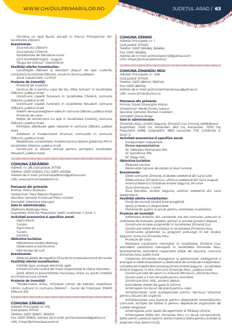 WWW.GHIDULPRIMARIILOR.RO JUDE%u021aUL ARAD / 63F%u00e2nt%u00e2na cu Ap%u0103 Bun%u0103, situat%u0103 %u00een Parcul Pompierilor din localitatea Z%u0103braniEvenimente:Ziua satului Z%u0103braniZiua satului Chesin%u0163S%u0103rb%u0103toarea de S%u00e2nziene-IunieDJ%u2032S SUMMER Night - august T%u00e2rgul de Cr%u0103ciun -DecembrieFacilit%u00e3%u0163i oferite investitorilor:Localit%u0103%u0163ile Z%u0103brani %u015fi Neudorf dispun de ap%u0103 curent%u0103, canalizare localitatea Z%u0103brani, acces la drum jude%u0163eanZon%u0103%u00a0industirial%u0103- cu PUZProiecte de investi%u0163ii:Proiecte de investi%u021biiCentrul de zi pentru copii de tip,, After School%u2033 %u00een localitatea Z%u0103brani, jude%u0163ul AradConstruire capel%u0103%u00a0 funerar%u0103 %u00een localitatea Chesin%u021b, comuna Z%u0103brani, jude%u021bul AradConstruire capel%u0103%u00a0 funerar%u0103 %u00een localitatea Neudorf, comuna Z%u0103brani, jude%u021bul AradSistem de supraveghere video %u00een comuna Z%u0103brani, jude%u021bul AradProiecte de viitorRe%u021bea de alimentare cu ap%u0103 %u00een localitatea Chesin%u0163, comuna Z%u0103brani, judetul Arad%u00cenfiin%u021bare, distribuire gaze naturale %u00een comuna Z%u0103brani, judetul AradAsfaltare %u0219i modernizare drumuri comunale %u00een comuna Z%u0103brani, jude%u021bul AradReabilitare, consolidare, modernizare %u0219i dotare gr%u0103dini%u021ba PN %u00een localitatea Z%u0103brani, jude%u021bul AradConstruire %u0219i dotare remiz%u0103%u00a0 pentru pompieri localitatea Neudorf, jude%u021bul AradCOMUNA Z%u0102D%u0102RENIAdres%u0103: nr. 28; Cod po%u0219tal: 317130Telefon: 0257-413024; Fax: 0257-413306; Adresa de e-mail: primariazadareni@yahoo.comURL: www.primariazadareni.roPersoane din primarie:Primar: Petru %u0218iclovanViceprimar: Paul R%u0103zvan PopoviciSecretar General: Emanuel Petru CorbeiContabil: Valentina Maru%u015fcaSate %u00een administra%u021bie:Z%u0103d%u0103reni, Bodrogu-NouSuprafa%u021ba:%u00a02145 ha; Popula%u021bia:%u00a02400; Gr%u0103dini%u021be:%u00a01; %u0218coli:%u00a01; Activitati economice si specifice zonei:Agricultur%u0103TurismAgricultur%u0103TurismComer%u0163Obiective turistice:M%u0103n%u0103stirea Hodo%u015f-BodrogObservatorul astronomicAlte l%u0103ca%u015fe de cultEvenimente:Zilele localit%u0103%u0163ii de regul%u0103 %u00een 23 iunie (%u00een a treia duminic%u0103 din iunie)Facilit%u00e3%u0163i oferite investitorilor:Utilit%u0103%u0163i (gaz, energie electric%u0103, ap%u0103)%u00a0Infrastructur%u0103 rutier%u0103 de mare importan%u0163%u0103 la c%u00e2%u0163iva kilometriZon%u0103 aflat%u0103 %u00een proximitatea municipiu Arad, cu acces imediat la infrastructura rutier%u0103Proiecte de investi%u0163ii:%u201cModernizare str%u0103zi, %u00eenfiin%u0163are c%u0103min de b%u0103tr%u00e2ni, reabilitare c%u0103min cultural %u00een comuna Z%u0103dreni%u201d - Sursa de finan%u0163are: PNDR M%u0103sura 322COMUNA Z%u0102RANDAdres%u0103: Principal%u0103, nr. 512; Cod po%u0219tal: 317415Telefon: 0257-359011, 359010; Fax: 0257-359011; Adresa de e-mail: primariazarand@yahoo.roURL: https://primariazarand.ro/COMUNA ZERINDAdres%u0103: Principal%u0103, nr. 1Cod po%u0219tal: 317420Telefon: 0257-355566, 355656; Fax: 0257-355566; Adresa de e-mail: primariazerind@yahoo.comURL: https://primariazerind.ro/COMUNA ZIMANDU NOUAdres%u0103: Principal%u0103, nr. 248Cod po%u0219tal: 317425Telefon: 0257-380141, 380140; Fax: 0257-380135; Adresa de e-mail: primariazimandunou@yahoo.roURL: www.zimandunou.roPersoane din primarie:Primar: Dorel Gheorghe VidranViceprimar: Rare%u0219 Ovidiu%u00a0IvasiucSecretar General:%u00a0Roman CodreanContabil: Diana BrejeSate %u00een administra%u021bie:Zimandu Nou, Andrei %u015eaguna, Zimand Cuz, Utvini%u015f, IasfeldioaraSuprafa%u021ba:%u00a0 7430 ha; Intravilan:%u00a0 360 ha; Extravilan:%u00a0 7070 ha; Popula%u021bia:%u00a0 5088; Gospod%u0103rii:%u00a0 1850; Locuin%u021be:%u00a0 1731; Gr%u0103dini%u021be:%u00a0 3; %u0218coli:%u00a03; Activitati economice si specifice zonei:Intreprinderi industrialeFirme reprezentative:SC Webasto Rom%u00e2naia SRLSc Symetrica SRL SC Nagy SRLObiective turistice:P%u0103durea Utvini%u0219Rezerva%u021bia natural de platan %u0219i alun turcescEvenimente:Zilele comunei Zimand, al doilea weekend din luna IulieZilele satului Zimand Cuz, ultimul weekend din luna AugustHramul Bisericii Ortodoxe Andrei %u0218aguna, 29 iunieZiua Utvini%u0219ului, 1 iunieZiua Recoltei, Andrei %u0218aguna, ultimul weekend din luna septembrieFacilit%u00e3%u0163i oferite investitorilor:For%u0163%u0103 de munc%u0103 t%u00e2n%u0103r%u0103 bine preg%u0103tit%u0103Spa%u0163ii %u015fi terenuri disponibileParteneriat public %u015fi privat pentru realizarea investi%u0163iilorProiecte de investi%u0163ii:Asfaltarea str%u0103zilor din cartierele noi ale comunei, precum %u0219i realizarea de trotuare, pode%u021be, %u0219an%u021buri %u0219i accese (proiect depus)Construire accese propriet%u0103%u021bi %u00een localitatea Zimand CuzConstruire sta%u021bie de autobuz %u00een localitatea Zimandu NouConstruirea gr%u0103dini%u021bei cu program prelungit %u00een sat Andrei %u0218aguna, comuna Zimandu NouProiecte de viitorRealizare canalizare menajer%u0103%u00a0 %u00een localitatea Zimand Cuz, extindere canalizare menajer%u0103%u00a0 %u00een localitatea Zimandu Nou, bran%u0219amente, extindere capacitate sta%u021bie de epurare, comuna Zimandu Nou-jude%u021b%u00a0AradCre%u0219terea eficien%u021bei energetice %u0219i gestionarea inteligent%u0103%u00a0 a energiei %u00een cl%u0103dirile publice cu destina%u021bie de unit%u0103%u021bi de %u00eenv%u0103%u021b%u0103m%u00e2ntunitatea de %u00eenv%u0103%u021b%u0103m%u00e2nt %u0219coala primara Andrei %u0218aguna %u2013 localitatea Andrei %u0218aguna, nr.164, comuna Zimandu Nou , jude%u021bul AradConstruire sal%u0103%u00a0de sport cu tribun%u0103%u00a0180 locuri, Zimandu NouConstruirea a 7 km de piste pentru bicicleteConstruire bloc ANL, proiect depusExtinderea re%u021belei de gaze la UtvinisAmenajare%u00a0no