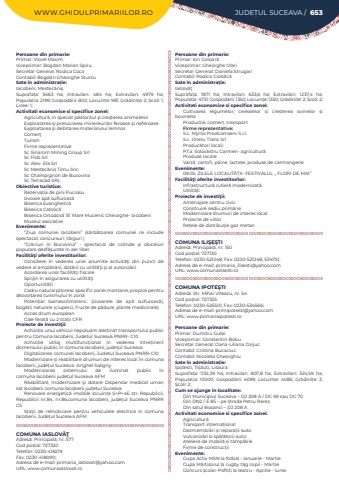 WWW.GHIDULPRIMARIILOR.RO JUDE%u021aUL SUCEAVA / 653Persoane din primarie:Primar: Viorel MaximViceprimar: Bogdan Marian SpiruSecretar General: Rodica CocaContabil: Bogdan Gheorghe SturzuSate %u00een administra%u021bie:Iacobeni, Mestec%u0103ni%u015fSuprafa%u021ba:%u00a0 5463 ha; Intravilan:%u00a0 484 ha; Extravilan:%u00a0 4979 ha; Popula%u021bia:%u00a02199; Gospod%u0103rii:%u00a0802; Locuin%u021be:%u00a0981; Gr%u0103dini%u021be:%u00a02; %u0218coli:%u00a01; Licee:%u00a01; Activitati economice si specifice zonei:Agricultur%u0103, %u00een special p%u0103storitul %u015fi cre%u015fterea animalelorExploatarea %u015fi prelucrarea minereurilor feroase %u015fi neferoaseExploatarea %u015fi debitarea materialului lemnosComer%u0163TurismFirme reprezentativeSc Sinarom Mining Group SrlSc Flob SrlSc Alex- Ela SrlSc Mestec%u0103ni%u0219 Timu SncSc Champignon de BucovinaSc Terracad SRLObiective turistice:Rezerva%u021bia de pini PuciosuIzvoare ap%u0103 sulfuroas%u0103Biserica Evanghelic%u0103Biserica Catolic%u0103Biserica Ortodox%u0103 Sf. Mare Mucenic Gheorghe- IacobeniMuzeul asocia%u021bieiEvenimente:%u201cZiua comunei Iacobeni%u201d (s%u0103rb%u0103toarea comunei ce include spectacol, concursuri, t%u00e2rguri )%u201cCr%u0103ciun %u00een Bucovina%u201d - spectacol de colinde %u015fi obiceiuri populare desf%u0103%u015furate %u00een aer liberFacilit%u00e3%u0163i oferite investitorilor:Consiliere %u00een vederea unei anumite activit%u0103%u0163i din punct de vedere al ampl%u0103s%u0103rii, dot%u0103rii cu utilit%u0103%u0163i %u015fi al autoriz%u0103riiAcordarea unor facilit%u0103%u0163i fiscaleSprijin %u00een%u00a0asigurarea cu utilit%u0103%u0163iOportunit%u0103%u021bi:Cadru natural pitoresc specific zonei montane, propice pentru dezvoltarea turismului %u00een zon%u0103Poten%u021bial balneoclimateric: (izvoarele de ap%u0103 sulfuroas%u0103), bog%u0103%u021bii naturale (ciuperci, fructe de p%u0103dure, plante medicinale)Acces drum europeanCale ferat%u0103 cu 2 sta%u021bii CFRProiecte de investi%u0163ii:Achizi%u021bia unui vehicul nepoluant destinat transportului public pentru Comuna lacobeni, Jude%u021bul Suceava PNRR- C10Achizi%u021bie utilaj multifunc%u021bional %u00een vederea %u00eentre%u021binerii domeniului public %u00een comuna lacobeni, jude%u0163ul SuceavaDigitalizarea comunei lacobeni, Judetul Suceava PNRR-C10Modernizare %u0219i reabilitare drumuri de interes local %u00een comuna lacobeni, jude%u021bul Suceava -Anghel SalignyModernizarea sistemului de iluminat public %u00een comuna%u00a0lacobeni jude%u021bul%u00a0Suceava AFMReabilitare, modernizare %u015fi dotare Dispensar medical uman sat lacobeni comuna%u00a0lacobeni jude%u021bul%u00a0SuceavaRenovare energetic%u0103%u00a0imobile locuin%u021be S+P+4E str. Republicii, Republicii nr.84, nr.86,comuna%u00a0 lacobeni, jude%u021bul%u00a0 Suceava PNRR C5Sta%u0163ii de re%u00eenc%u0103rcare pentru vehiculele electrice %u00een comuna lacobeni, Jude%u021bul%u00a0Suceava AFMCOMUNA IASLOV%u0102%u0162Adres%u0103: Principal%u0103, nr. 577Cod po%u0219tal: 727320Telefon: 0230-418219; Fax: 0230-418090; Adresa de e-mail: primaria_iaslovat@yahoo.comURL: www.comunaiaslovat.roPersoane din primarie:Primar: Ion Cotoar%u0103Viceprimar: Gheorghe OlariSecretar General: Daniela StrugariContabil: Rodica Ciob%u00e2c%u0103Sate %u00een administra%u021bie:Iaslov%u0103%u0163Suprafa%u021ba:%u00a0 1871 ha; Intravilan:%u00a0 633,6 ha; Extravilan:%u00a0 1237,4 ha; Popula%u021bia:%u00a04731; Gospod%u0103rii:%u00a01350; Locuin%u021be:%u00a01350; Gr%u0103dini%u021be:%u00a02; %u0218coli:%u00a02; Activitati economice si specifice zonei:Cultivarea legumelor, cerealelor %u0219i cre%u0219terea ovinelor %u0219i bovinelor Produc%u021bie, comer%u021b, transportFirme reprezentative:S.c. Myrtis Prodcomserv S.r.l.S.c. Onelu Trans SrlProduc%u0103tori locali:P.f.a. Solov%u0103stru Carmen- agricultur%u0103 Produse locale:Varz%u0103, cartofi, p%u00e2ine, lactate, produse de carmangerieEvenimente:09.05. ZILELE LOCALIT%u0102%u021aII- FESTIVALUL ,, FLORI DE MAI%u201dFacilit%u00e3%u0163i oferite investitorilor:Infrastructur%u0103 rutier%u0103 modernizat%u0103Utilit%u0103%u021biProiecte de investi%u0163ii:Amenajare centru civicConstruire sediu prim%u0103rieModernizare drumuri de interes localProiecte de viitorRe%u021bele de distribu%u021bie gaz metanCOMUNA ILI%u015eE%u015eTIAdres%u0103: Principal%u0103, nr. 150Cod po%u0219tal: 727130Telefon: 0230-521248; Fax: 0230-521248, 534751; Adresa de e-mail: primaria_ilisesti@yahoo.comURL: www.comunailisesti.roCOMUNA IPOTE%u015eTIAdres%u0103: Str. Mihai Viteazu, nr. 54Cod po%u0219tal: 727325Telefon: 0230-525501; Fax: 0230-534566; Adresa de e-mail: primipotesti@yahoo.comURL: www.primariaipotesti.roPersoane din primarie:Primar: Dumitru GuleiViceprimar: Constantin BobuSecretar General: Oana-Liliana CorjucContabil: Cristina BucaciucContabil: Nicoleta GheorghiuSate %u00een administra%u021bie:Ipote%u0219ti, Ti%u0219%u0103u%u021bi, LisauraSuprafa%u021ba:%u00a0 1132,39 ha; Intravilan:%u00a0 807,8 ha; Extravilan:%u00a0 324,59 ha; Popula%u021bia:%u00a0 10000; Gospod%u0103rii:%u00a0 4099; Locuin%u021be:%u00a0 4085; Gr%u0103dini%u021be:%u00a0 3; %u0218coli:%u00a02; Cum se ajunge in localitate:Din Municipiul Suceava %u2013 DJ 208 A / DC 69 sau DC 70Din DN2 / E 85 %u2013 pe strada Petru Rare%u0219 Din satul Bosanci %u2013 DJ 208 AActivitati economice si specifice zonei:Agricultur%u0103Transport interna%u021bionalDezmembr%u0103ri %u0219i repara%u021bii autoVulcaniz%u0103ri %u0219i sp%u0103l%u0103torii autoAteliere de mobil%u0103 %u0219i t%u00e2mpl%u0103rie Firme de construc%u021biiEvenimente:Cupa Activ MSN%u00a0la fotbal - Ianuarie - MartieCupa M%u0103r%u021bi%u0219orul%u00a0la rugby t%u00e2g copii - MartieConcurs %u0219colar-Pofti%u021bi la teatru%u00a0- Aprilie - Iunie