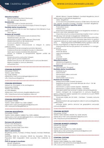 Obiective turistice:Biserica Adormirea Maicii Domnului Parc dendrologic BerezeniEvenimente:Pia%u021ba comunal%u0103%u00a0%u00een fiecare duminic%u0103Ziua comunei- prima duminic%u0103%u00a0dupa sf. Maria 15 augustFacilit%u00e3%u0163i oferite investitorilor:Drum na%u0163ional DN 24 care face leg%u0103tura %u00eentre B%u00e2rlad %u0219i Husi; Gala%u021bi %u0219i Ia%u0219iTeren agricolProiecte de investi%u0163ii:Extindere %u0219i modernizare %u0219coala Anastasie F%u0103tuReabilitare teatru de var%u0103Alimentare cu ap%u0103%u00a0%u00een satele R%u00e2nceni Sistuhule%u021bModernizare drumuri de interes localConstruire platform%u0103%u00a0de gunoiEcosistem digital interconecatat %u0219i integrat %u00een cadrul jude%u021bului%u00a0VasluiCre%u0219terea eficien%u021bei energetice prim%u0103ria BerezeniCre%u0219terea eficien%u021bei energetice %u0218coala nr.2 BerezeniTeren sport %u0219coala Anastasie F%u0103tu BerezeniDotare cu mobilier %u0219i echipamente digitale unit%u0103%u021bi de %u00eenv%u0103%u021b%u0103m%u00e2ntConstruire centru comunitar integratSprijin pentru prima %u00eemp%u0103durireModernizare drumuri de interes local %u00een comuna%u00a0BerezeniRigole %u0219i pode%u021be %u00een comuna Berezeni Actualizare PUGCOMUNA BL%u0102GE%u015eTICod po%u0219tal: 737070Telefon: 0235-709790; Fax: 0235-709790; Adresa de e-mail: primariablagesti@gmail.comURL: http://www.blagesti.roCOMUNA BOGDANAAdres%u0103: Str. Principal%u0103, nr.34, sat BogdanaCod po%u0219tal: 737075Telefon: 0371-303730; ax: 0372-892824; Adresa de e-mail: primaria_bogdana@yahoo.comURL: https://www.comuna-bogdana-vaslui.ro/COMUNA BOGD%u0102NE%u015eTICod po%u0219tal: 737085Telefon: 0235-428827; Fax: 0235-428827; Adresa de e-mail: primbogdanesti@yahoo.comURL: www.primariabogdanesti.roCOMUNA BOGD%u0102NI%u0162ACod po%u0219tal: 737095Telefon: 0235-428802, 428860; Fax: 0235-428860; Adresa de e-mail: secretar@bogdanita.ro, contact@bogdanita.roURL: https://www.bogdanita.ro/Persoane din primarie:Primar: Ioan BurdujanuViceprimar: Ionel Che%u0219cuSecretar General: Nela Carla PelinContabil: Ilior ArmeneSate %u00een administra%u021bie:Bogd%u0103ni%u0163a, Schitu, Tunse%u015fti, C%u00eertiba%u015fi, Cepe%u015fti, Coroie%u015fti, R%u0103d%u0103ie%u015fti, Cepe%u015ftiSuprafa%u021ba:%u00a0 3953 ha; Intravilan:%u00a0 218,33 ha; Extravilan:%u00a0 3735 ha; Popula%u021bia:%u00a0 1367; Gospod%u0103rii:%u00a0 1040; Locuin%u021be:%u00a0 704; Gr%u0103dini%u021be:%u00a0 3; %u0218coli:%u00a03; Cum se ajunge in localitate:B%u00e2rlad- Bogd%u0103ni%u021ba33 min (28,8 km) pe DJ245 %u0219i DJ245CB%u00e2rlad- B%u0103cani- Cepe%u0219ti-R%u0103d%u0103e%u0219ti- Coroie%u0219ti-Bogd%u0103ni%u021ba ( drum asfaltat p%u00e2n%u0103 la M%u0103n%u0103stirea Bogd%u0103ni%u021ba)Vaslui- Bogd%u0103ni%u021ba 41 min (31,5 km) pe DJ245A racord cu DC86 Vaslui-Muntenii de Jos- Lipov%u0103%u021b- Suceveni-Tunse%u0219ti %u2013C%u00e2r%u021biba%u0219i %u2013Coroie%u0219ti- Bogd%u0103ni%u021baActivitati economice si specifice zonei:Produc%u0103tori locali:FERMA URSUhttps://www.vremeanoua.ro/comuna-bogdanita-renaste-cuajutorul-a-doi-tineri-deosebiti-foto/https://ziarullumina.ro/societate/reportaj/doi-tineri-cultiva120-de-soiuri-de-tomate-la-bogdanita-148109.htmlhttps://www.google.com/amp/s/www.libertatea.ro/stiri/doitineri-si-au-construit-o-ferma-in-cautarea-legumelor-cu-gustulcopilariei-trebuie-sa-avem-grija-de-pamantul-nostru-3534876/amp https://agrointel.ro/279198/buchetul-gradinii-creat-detanara-anca-fogoros-cu-legume-din-propria-fermahttps://revista-ferma.ro/a-pierdut-un-autobuz-si-a-castigatun-brand/Produse locale:Miere de albineLegume proaspeteC%u0103tin%u0103Lavand%u0103 Produse lactateObiective turistice:M%u0103n%u0103stirea Bogd%u0103ni%u021baBiserica de lemn de la C%u00e2r%u021biba%u0219iEvenimente:Ziua comunei- 15 augustFacilit%u00e3%u0163i oferite investitorilor:Fort%u0103 de muncZon%u0103 lini%u0219tit%u0103Monitorizare video a comuneiDrum asfaltatAlte facilit%u0103%u021bi sunt %u00een lucruProiecte de investi%u0163ii:Modernizare DC86 Tunse%u0219ti SuceveniReabilitare drumuri comunale afectate de viituri %u2013 DC 86Cadastru sistematicAlimentare cu ap%u0103 %u00een satele Cepe%u0219ti %u2013 R%u0103d%u0103ie%u0219tiAlimentare cu ap%u0103 %u00een satele Coroie%u0219ti %u2013 Cartiba%u0219iExtindere sistem de iluminat %u00een satele comunei Bogd%u0103ni%u021baSistem inteligent de management %u00een comuna Bogd%u0103ni%u021ba pentru integrarea datelor spa%u021biale %u00eentr-o solu%u021bie (G.i.S.) prin PNRR /2022/c10 ac%u021biunea i.1.2%u00centre%u021binere DC86, din DJ 245C - Cartiba%u0219i - Tunse%u0219ti, comuna Bogd%u0103ni%u021baRealizare sistem de supraveghere video %u00een comuna Bogd%u0103ni%u021ba, jude%u021bul Vaslui Achizi%u021bie dot%u0103ri pentru serviciul de gospod%u0103rie comunal%u0103, comuna Bogd%u0103niCOMUNA BO%u0162E%u015eTICod po%u0219tal: 737105Telefon: 0235-484508, 484216; Fax: 0235-484216; Adresa de e-mail: comunabotestivs@yahoo.comURL: http://www.primariabotesti.roCOMUNA BUNE%u015eTI AVERE%u015eTIAdres%u0103: Sat Avere%u015ftiCod po%u0219tal: 737110Telefon: 0235-484820; Fax: 0235-484820; Adresa de e-mail: primariabunestiaveresti@yahoo.comURL: https://www.averesti.ro/COMUNA CIOCANICod po%u0219tal: 737406Telefon: 0235-709826; Fax: 0235-709826; Adresa de e-mail: primaria.ciocani@yahoo.comURL: www.primariaciocani.ro726 / JUDE%u021aUL VASLUI WWW.GHIDULPRIMARIILOR.RO