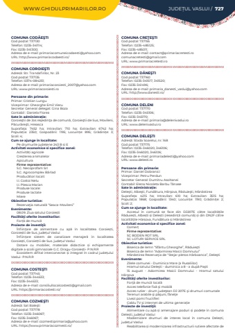 WWW.GHIDULPRIMARIILOR.RO JUDE%u021aUL VASLUI / 727COMUNA COD%u0102E%u015eTICod po%u0219tal: 737130Telefon: 0235-341114; Fax: 0235-341300; Adresa de e-mail: primariacomuneicodaesti@yahoo.comURL: http://www.primariacodaesti.ro/COMUNA COROIE%u015eTIAdres%u0103: Str. Trandafirilor, Nr. 23Cod po%u0219tal: 737135Telefon: 0374-084251; Adresa de e-mail: primariacoroiesti_2007@yahoo.comURL: www.primariacoroiesti.roPersoane din primarie:Primar: Cristian LunguViceprimar: Gheorghe Emil Vieru%u00a0Secretar General delegat: Gina BozaContabil : Daniela FloreaSate %u00een administra%u021bie:Coroie%u015ftii de Jos re%u015fedin%u0163a de comun%u0103, Coroie%u015ftii de Sus, Movileni, P%u0103cur%u0103re%u015fti, HreascaSuprafa%u021ba:%u00a0 7452 ha; Intravilan:%u00a0 710 ha; Extravilan:%u00a0 6742 ha; Popula%u021bia:%u00a0 2350; Gospod%u0103rii:%u00a0 1195; Locuin%u021be:%u00a0 895; Gr%u0103dini%u021be:%u00a0 3; %u0218coli:%u00a04; Cum se ajunge in localitate:Pe drumurile jude%u021bene 243 B %u0219i EActivitati economice si specifice zonei:Activit%u0103%u021bi agricoleCre%u0219terea animalelorApiculturaFirme reprezentative:S.C. Necoprofam SrlS.C. Agrocomplex B%u00e2rladProduc%u0103tori locali:I.I. Costoi NeluI.I. Plesca MarianProduse locale:Produse lactate MiereObiective turistice:Rezerva%u0163ia natural%u0103%u00a0%u201cSeaca-Movileni%u201dEvenimente:08.09. Ziua satului Coroie%u0219tiFacilit%u00e3%u0163i oferite investitorilor:For%u021b%u0103 de munc%u0103Proiecte de investi%u0163ii:%u00cenfiin%u021bare de alimentare cu ap%u0103 %u00een localitatea Coroie%u0219ti, Coroie%u0219tii de Sus, jude%u021bul Vaslui %u00cenfiin%u021bare sistem de canalizare menajer%u0103 %u00een localitatea Coroie%u0219ti, Coroie%u021btii de Sus. jude%u021bul VasluiDotare cu mobilier, materiale didactice %u0219i echipamente digitale a %u0219colii gimnaziale G.C. Dragu-Coroie%u0219ti- P.N.R.REcosistem difital interconectat %u0219i integrat %u00een cadrul jude%u021bului Vaslui- P.N.R.RCOMUNA COSTE%u015eTICod po%u0219tal: 737145Telefon: 0235-344533; Fax: 0235-344533; Adresa de e-mail: consiliullocalcostesti@gmail.comURL: https://primariacostesti.ro/COMUNA COZME%u015eTIAdres%u0103: Sat Bale%u015ftiCod po%u0219tal: 737178Telefon: 0235-346067; Fax: 0235-346067; Adresa de e-mail: cozmestiprimaria@yahoo.comURL: https://www.primariacozmesti.ro/COMUNA CRE%u0162E%u015eTICod po%u0219tal: 737155Telefon: 0235-485125; Fax: 0235-485011; Adresa de e-mail: contact@primariacretesti.ro comunacretesti@gmail.comURL: www.primariacretesti.roCOMUNA D%u0102NE%u015eTICod po%u0219tal: 737160Telefon: 0235-341517, 341520; Fax: 0235-341496; Adresa de e-mail: primaria_danesti_vaslui@yahoo.comURL: http://www.danesti.ro/COMUNA DELENICod po%u0219tal: 737170Telefon: 0235-345106; Fax: 0235-345170; Adresa de e-mail: primaria@delenivaslui.roURL: www.delenivaslui.roCOMUNA DELE%u015eTIAdres%u0103: Stada Soarelui, nr. 168Cod po%u0219tal: 737175Telefon: 0235-346020, 346106; Fax: 0235-346020, 346106; Adresa de e-mail: primariadelesti@yahoo.comURL: www.delesti.roPersoane din primarie:Primar: Daniel%u00a0DobraniciViceprimar: Petru PerdunSecretar General: Dumitru%u00a0AsoltaneiContabil: Elena Nicoleta%u00a0Barbu T%u0103nase%u00a0Sate %u00een administra%u021bie:Dele%u015fti, Albe%u015fti, Fund%u0103tura, H%u00e2r%u015fova, R%u0103duie%u015fti, M%u00e2n%u0103stireaSuprafa%u021ba:%u00a0 4215 ha; Intravilan:%u00a0 610 ha; Extravilan:%u00a0 3515 ha; Popula%u021bia:%u00a0 1868; Gospod%u0103rii:%u00a0 1340; Locuin%u021be:%u00a0 1190; Gr%u0103dini%u021be:%u00a0 2; %u0218coli:%u00a02; Cum se ajunge in localitate:Accesul %u00een comun%u0103%u00a0 se face din DJ207E c%u0103tre localit%u0103%u021bile R%u0103duie%u0219ti, Albe%u0219ti %u0219i Dele%u0219ti (resedin%u021b%u0103%u00a0comun%u0103) %u0219i din DN2F c%u0103tre localit%u0103%u021bile H%u00e2r%u0219ova, Fund%u0103tura %u0219i M%u0103n%u0103stireaActivitati economice si specifice zonei:Comer%u021bFirme reprezentative:SC BODEN ROT SRL SC LOTURI SERVICE SRLObiective turistice:Biserica de lemn %u201cSf%u00e2ntu Gheorghe%u201d, R%u0103duie%u015ftiBiserica de lemn %u201cAdormirea Maicii Domnului%u201d M%u00e2n%u0103stirea Rezerva%u0163ia de %u201cStejar pletos H%u00e2rboanca%u201d, Dele%u015ftiEvenimente:Zilele comunei - Duminica Mare (a Rusaliilor)Hramul satului Dele%u015fti - duminica a 8 - a dup%u0103 Pa%u015fti 15 august - Adormirea Maicii Domnului - Hramul satului H%u00e2r%u015fovaFacilit%u00e3%u0163i oferite investitorilor:For%u0163%u0103 de munc%u0103 local%u0103Acces telefonie fix%u0103 %u015fi mobil%u0103Acces rutier - drum jude%u0163ean DJ 207E %u015fi drumuri comunaleTerenuri arabile %u015fi p%u0103%u015funi, f%u00e2ne%u0163eLivezi pomi fructiferiCablu TV %u015fi internet de ultima genera%u021bieProiecte de investi%u0163ii:Alimentare cu ap%u0103%u00a0%u0219i amenajare poduri %u0219i pode%u021be %u00een comuna Dele%u0219ti, jude%u021bul VasluiModernizare drumuri de interes local %u00een comuna Dele%u0219ti, jude%u021bul VasluiReabilitarea %u0219i modernizarea infrastructurii rutiere afectate de