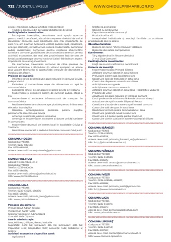 eroilor, momente cultural-artistice (1 Decembrie)Tradi%u021bii %u0219i obiceiuri din perioada S%u0103rb%u0103torilor de iarn%u0103Facilit%u00e3%u0163i oferite investitorilor:%u00cencurajarea investi%u021biilor, dezvoltarea unui spa%u021biu oportun pentru mediul de afaceri, al%u0103turi de cre%u0219terea nivelului de trai al locuitorilor comunei, sunt obiectivele cele mai importante pe care ni le-am asumat. Accesul la utilit%u0103%u021bi publice (ap%u0103, canalizare, energie electric%u0103), infrastructura rutier%u0103 modernizat%u0103, iluminatul public modernizat, demersuri pentru cre%u0219terea atractivit%u0103%u021bii turistice a comunei, posibilitatea de a concesiona terenuri pentru activit%u0103%u021bi economice, dar mai ales proximitatea fa%u021b%u0103 de ora%u0219 (9 km) %u0219i pozi%u021bionarea pe drumul national Gala%u021bi- B%u00e2rlad sunt aspect importante care atrag investitorii. De asemenea, traversarea comunei de c%u0103tre %u0219oseaua de centur%u0103 ocolitoare a B%u00e2rladului (%u00een viitorul apropiat) va aduce plus valoare terenurilor %u0219i oportunit%u0103%u021bi crescute de dezvoltare a mediului de afaceri.Proiecte de investi%u0163ii:%u00cenfiin%u0163are re%u0163ea de distribu%u0163ie gaze naturale %u00een comuna Grivi%u0163a, jude%u0163ul VasluiExtindere %u0219i modernizare re%u021bea de alimentare cu ap%u0103 %u00een comuna Grivi%u021baExtinderea re%u0163elei de canalizare %u00een satele Grivi%u0163a %u015fi TrestianaModernizare %u0219i extindere sistem de iluminat public, etapa a II-aModernizare %u0219i extindere infrastructur%u0103 de transport %u00een comuna Grivi%u021baRealizare sistem de colectare ape pluviale pentru %u00eenl%u0103turarea efectelor inunda%u021biilorRealizare amenajamente pastorale pentru paji%u015ftile permanente din comuna Grivi%u021baAmenajare spa%u021bii de joac%u0103 %u0219i recreativeAmenajare, modernizare, extindere %u0219i dotare unit%u0103%u021bi sanitare %u00een comun%u0103 etc.Modernizare drumuri de interes local %u00een localit%u0103%u0163ile Grivi%u0163a %u015fi Trestiana Reabilitare moderat%u0103 a sediului Prim%u0103riei comunei Grivi%u0163a etc.COMUNA HOCENICod po%u0219tal: 737285Telefon: 0235-485483; Fax: 0235-485493; Adresa de e-mail: hoceniprimaria@yahoo.comMUNICIPIUL HU%u015eIAdres%u0103: 1 Decembrie, nr. 9Cod po%u0219tal: 735100Telefon: 0235-480009; Fax: 0235-480126; Adresa de e-mail: primar@primariahusi.roURL: www.primariahusi.roCOMUNA IANACod po%u0219tal: 737295Telefon: 0235-436215, 436275; Fax: 0235-436215; Adresa de e-mail: primaria_iana@yahoo.comURL: www.primariaiana.roPersoane din primarie:Primar: Ionu%u0163 Adrian TotoliciViceprimar: Aurel TurleaSecretar General: jr. Adina Capr%u0103Contabil: Nela C%u0103praruSate %u00een administra%u021bie:Iana, H%u0103l%u0103re%u015fti, Sili%u015ftea, Recea,%u00a0VadurileSuprafa%u021ba:%u00a0 4470 ha; Intravilan:%u00a0 335 ha; Extravilan:%u00a0 4135 ha; Popula%u021bia:%u00a0 4138; Gospod%u0103rii:%u00a0 1527; Locuin%u021be:%u00a0 1436; Gr%u0103dini%u021be:%u00a0 5; %u0218coli:%u00a05; Activitati economice si specifice zonei:Agricultur%u0103Cre%u0219terea animalelorComer%u021b%u00a0cu am%u0103nuntulDepozite materiale construc%u021biiProduc%u0103tori locali:Intreprinderi individuale %u0219i asocia%u021bii familiale cu activitate principal%u0103%u00a0de sere %u0219i solariiiObiective turistice:Biserica din lemn %u201cSfin%u0163ii Voievozi%u201d H%u0103l%u0103re%u015ftiBisericile din satele componenteEvenimente:T%u00e2rg s%u0103pt%u0103m%u00e2nal %u00een fiecare s%u00e2mb%u0103t%u0103 21 mai Ziua ComuneiFacilit%u00e3%u0163i oferite investitorilor:For%u0163%u0103 de munc%u0103 calificat%u0103 %u0219i necalificat%u0103Proiecte de investi%u0163ii:Modernizare %u0219coala Primar%u0103%u00a0Sili%u0219teaAsfaltare drumuri s%u0103te%u0219ti %u00een satul Sili%u0219teaPrelungire sistem ap%u0103%u00a0localitatea IanaConstruire Sal%u0103%u00a0de festivit%u0103%u021bi %u00een satul IanaConstruire dispensar uman %u00een satul IanaAchizi%u021bionare autogredeAchizi%u021bionare tractor cu remorc%u0103Asfaltare drumuri s%u0103te%u0219ti %u00een satul Iana , H%u0103l%u0103re%u0219ti %u0219i VadurileProiecte de viitorAduc%u021biune de gaze naturale %u00een %u00eentreaga comun%u0103Dou%u0103%u00a0proiecte de asfaltare a 16 km de drumuri s%u0103te%u0219tiAduc%u021biune de ap%u0103%u00a0%u00een satele Sili%u0219tea %u0219i ReceaCanalizare %u0219i sta%u021bie de tratare a apei %u00een toat%u0103%u00a0comunaConstruire sal%u0103%u00a0de sport %u00een satul IanaReabiltare termic%u0103%u00a0%u0219coala Gimnazial%u0103%u00a0Nr.1 IanaConstruire gr%u0103dini%u021b%u0103%u00a0nou%u0103%u00a0%u00een satul IanaConstruire a 3 poduri peste p%u00e2r%u00e2ul StudinetConstruire c%u0103min cultural %u00een satele H%u0103l%u0103re%u0219ti %u0219i Sili%u0219tea COMUNA IB%u0102NE%u015eTICod po%u0219tal: 737013Telefon: 0235-429309; Fax: 0235-429309; Adresa de e-mail: primaria_ibanesti_vs@yahoo.comURL: http://primariaibanestivs.ro/COMUNA IV%u0102NE%u015eTICod po%u0219tal: 737300Telefon: 0235-340506; Fax: 0235-340575; Adresa de e-mail: ontact@comunaivanesti.roURL: www.comunaivanesti.roCOMUNA IVE%u015eTICod po%u0219tal: 737320Telefon: 0235-428586, 428697; Fax: 0235-428586; Adresa de e-mail: primaria_ivesti@yahoo.comURL: http://www.comunaivesti.roCOMUNA LAZACod po%u0219tal: 737325Telefon: 0235-346674; Fax: 0235-346674; Adresa de e-mail: primarialaza@yahoo.comURL: www.primarialazavs.roCOMUNA LIPOV%u0102%u0162Cod po%u0219tal: 737335Telefon: 0235-345740; Fax: 0235-345740; Adresa de e-mail: contact@comuna-lipovat.roURL: www.comuna-lipovat.ro732 / JUDE%u021aUL VASLUI WWW.GHIDULPRIMARIILOR.RO