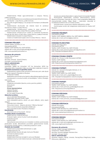 WWW.GHIDULPRIMARIILOR.RO JUDE%u021aUL VRANCEA / 775Modernizarea Pie%u021bei agro-alimentare a ora%u0219ului Panciu, jude%u021bul VranceaLucr%u0103ri de reabilitare %u0219i consolidare pod strada Mihai Eminescu, paraul H%u0103ulita %u2013 ora%u0219 Panciu, jude%u021b VranceaPrin PNI Anghel Saligny, s-au propus la finan%u021bare urm%u0103toarele proiecte:Modernizarea drumurilor de interes local %u00een cartierul Dumbrava, etapa II, ora%u0219ul PanciuModernizarea infrastructurii rutiere %u00een zona central%u0103%u00a0 %u0219i cartierul Crucea de Sus, ora%u0219ul Panciu, jude%u021bul VranceaModernizarea infrastructurii rutiere %u00een cartierele Dumbrava, Crucea de Jos, Neicu %u0219i Satu-Nou, ora%u0219ul Panciu, jude%u021bul VranceaModernizare trotuare %u00een ora%u0219ul PanciuCreare %u0219i modernizare spa%u021bii verzi %u00een orasul Panciu %u2013 lotul 2COMUNA P%u0102ULE%u015eTIAdres%u0103: %u015etefan cel Mare, nr. 44Cod po%u0219tal: 627371Telefon: 0237-631750; Fax: 0237-631750; Adresa de e-mail: primariapaulesti@yahoo.comURL: www.paulesti.primarievn.roPersoane din primarie:Primar: D%u0103nu%u021b%u00a0Soare%u00a0Viceprimar:%u00a0Secretar General:%u00a0 Viorel%u00a0G%u00eerleanuContabil: Lumini%u0163a%u00a0Roini%u0163%u0103Sate %u00een administra%u021bie:P%u0103ule%u015fti, H%u0103uli%u015fcaSuprafa%u021ba:%u00a0 16848 ha; Intravilan:%u00a0 147 ha; Extravilan:%u00a0 16701 ha; Popula%u021bia:%u00a01834; Gospod%u0103rii:%u00a0655; Locuin%u021be:%u00a0655; Gr%u0103dini%u021be:%u00a03; %u0218coli:%u00a03; Activitati economice si specifice zonei:Exploatarea %u015fi prelucrarea primar%u0103 a lemnului prin cele dou%u0103 ob%u015fti de mo%u015fneni: P%u0103ule%u015fti %u015fi H%u0103uli%u015fcaProduc%u0163ie mobil%u0103Realizarea unei infrastructuri pentru dezvoltarea agroturismuluiIntroducere %u00een circuitul turistic al localit%u0103%u0163ilor: Tulnici, P%u0103ule%u015fti, Vr%u00e2ncioaiaAgricultur%u0103Cre%u015fterea animalelor (bovine, ovine, porcine, p%u0103s%u0103ri)Silvicultur%u0103Comer%u0163Firme reprezentative:Ob%u0219tea P%u0103ule%u0219tiOb%u0219tea H%u0103uli%u0219ca SC Cia Mobil Forest SRLObiective turistice:Locuri pitore%u015fti f%u0103r%u0103 poluareRezerva%u0163ia natural%u0103 Cheile Ti%u015fi%u0163eiZon%u0103 deosebit%u0103 pentru v%u00e2nat: urs, porc s%u0103lbatic, cerb, capr%u0103 neagr%u0103Cascada Horn-MioareleMonument istoric - Biserica de lemn %u201cSf%u00e2ntul Nicolae%u201dPlaca comemorativ%u0103 Leopoldina B%u0103l%u0103nu%u021b%u0103 Monumentele eroilor P%u0103ule%u0219ti %u0219i H%u0103uli%u0219caEvenimente:Ziua Comunei %u015fi Ziua %u015ecolii - 18 maiFacilit%u00e3%u0163i oferite investitorilor:Materii prime: material lemnosProduse: lapte, carne, fructe, fructe de p%u0103dureFor%u0163%u0103 de munc%u0103Oportunit%u0103%u021biDezvoltarea ecoturismului %u0219i a traseelor turistice, promovarea produselor locale, dezvoltarea punctelor gastronomice locale, %u00eencurajarea tinerilor pentru a dezvolta proiecte %u00een zon%u0103Proiecte de investi%u0163ii:Modernizare %u0219i extindere alimentare cu ap%u0103Modernizare DC 70Suplimentare resursa de ap%u0103, Comuna P%u0103ule%u0219tiAchizi%u021bie buldoexcavatorProiecte de viitorModernizare Iluminat stradal %u00een comuna P%u0103ule%u0219tiAsfaltare drumuri de interes local pe o distan%u021b%u0103 de 5,5 kmConstruire sal%u0103 de festivit%u0103%u021bi %u00een cadrul %u0218colii Gimnaziale P%u0103ule%u0219tiPromovarea obiectivelor turistice (Monumentul istoric Biserica Sf Nicolae, Cascada din Horn, Casa Leopoldina B%u0103l%u0103nu%u021b%u0103, monumentele eroilor, R%u00e2pa Ro%u0219ie %u2013 rezerva%u021bie natural%u0103) %u0219i %u00eencadrarea acestora %u00eentr-un traseu turisticAchizi%u021bie teren, construire %u0219i dotare sal%u0103 pentru utilajeContinuarea lucr%u0103ri de %u00eenregistrare sistematic%u0103%u00a0la nivelul UAT P%u0103ule%u0219tiCOMUNA P%u0102UNE%u015eTICod po%u0219tal: 627260Telefon: 0237-268600, 268104; Fax: 0237-268104, 268600; Adresa de e-mail: primaria@paunesti.roCOMUNA PLOSCUTENIAdres%u0103: Sat PloscuteniCod po%u0219tal: 627175Telefon: 0237-272400; Fax: 0237-272400; Adresa de e-mail: primaria.ploscuteni@yahoo.comURL: http://primariaploscuteni.roCOMUNA POIANA CRI%u015eTEIAdres%u0103: Str. Pinului nr.28; Cod po%u0219tal: 627265Telefon: 0237-252182; Adresa de e-mail: poianacristeiprimaria@yahoo.comURL: https://www.primariapoianacristeivn.ro/COMUNA POPE%u015eTIAdres%u0103: Str. General Gheorghe Zaharia, nr. 14Cod po%u0219tal: 627385Telefon: 0237-251911; Fax: 0237-251911; Adresa de e-mail: prim_popesti@yahoo.comURL: http://primariapopestivn.ro/comuna.phpCOMUNA PUFE%u015eTICod po%u0219tal: 627275Telefon: 0237-263052; Fax: 0237-263333; Adresa de e-mail: primaria_pufesti@yahoo.comURL: http://www.comunapufesti.roCOMUNA R%u0102COASACod po%u0219tal: 627280Telefon: 0237-670653; Fax: 0237-670653; Adresa de e-mail: primaria_racoasa2008@yahoo.comCOMUNA R%u0102STOACAAdres%u0103: Principal%u0103Cod po%u0219tal: 627208Telefon: 0237-267400; Fax: 0237-267434; Adresa de e-mail: primar@rastoaca.primarievn.roURL: www.rastoaca.primarievn.roCOMUNA REGHIUCod po%u0219tal: 627285Telefon: 0237-631010; Fax: 0237-631010; Adresa de e-mail: primar@reghiu.primarievn.roURL: www.reghiu.primarievn.roPersoane din primarie:Primar: C%u0103t%u0103lin Georgel%u00a0Valis%u0103reanuViceprimar: Toader C%u0103linoiuSecretar General delegat:%u00a0Mariana%u00a0EneContabil:%u00a0 Nicu%u015for%u00a0Miron%u00a0Sate %u00een administra%u021bie:%u015eindrilari, Reghiu, R%u0103iu%u0163i, Ursoaia, Farca%u015f,Piscul Reghiului, Valea Milcovului, Jgheaburi